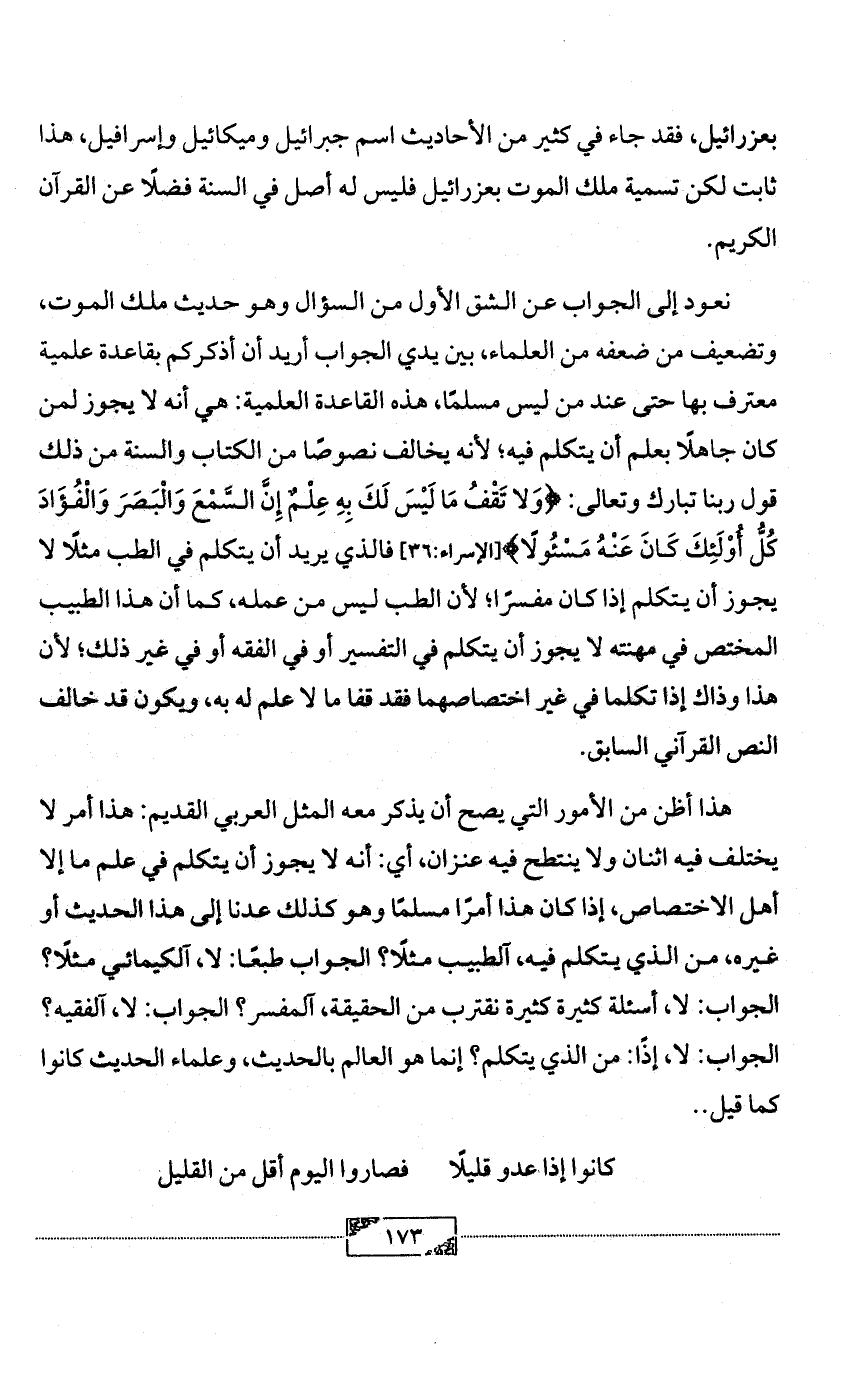نعود إلى الجواب عن الشق الأول من السؤال وهو حديث ملك الموت، وتضعيف من ضعفه من العلماء، بين يدي الجواب أريد أن أذكركم بقاعدة علمية معترف بها حتى عند من ليس مسلمًا، هذه القاعدة العلمية: هي أنه لا يجوز لمن كان جاهلًا بعلم أن يتكلم فيه؛ لأنه يخالف نصوصًا من الكتاب والسنة من ذلك قول ربنا تبارك وتعالى: {وَلا تَقْفُ مَا لَيْسَ لَكَ بِهِ عِلْمٌ إِنَّ السَّمْعَ وَالْبَصَرَ وَالْفُؤَادَ كُلُّ أُوْلَئِكَ كَانَ عَنْهُ مَسْئُولًا} [الإسراء:36] فالذي يريد أن يتكلم في الطب مثلًا لا يجوز أن يتكلم إذا كان مفسرًا؛ لأن الطب ليس من عمله، كما أن هذا الطبيب المختص في مهنته لا يجوز أن يتكلم في التفسير أو في الفقه أو في غير ذلك؛ لأن هذا وذاك إذا تكلما في غير اختصاصهما فقد قفا ما لا علم له به، ويكون قد خالف النص القرآني السابق.