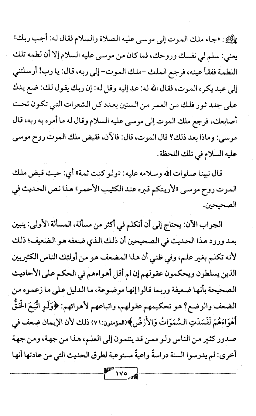 - صلى الله عليه وآله وسلم -: «جاء ملك الموت إلى موسى عليه الصلاة والسلام فقال له: أجب ربك» يعني: سلم لي نفسك وروحك، فما كان من موسى عليه السلام إلا أن لطمه تلك اللطمة ففقأ عينه، فرجع الملك -ملك الموت- إلى ربه، قال: يا رب! أرسلتني إلى عبد يكره الموت، فقال الله له: عد إليه وقل له: إن ربك يقول لك: ضع يدك على جلد ثور فلك من العمر من السنين بعدد كل الشعرات التي تكون تحت أصابعك، فرجع ملك الموت إلى موسى عليه السلام وقال له ما أمره به ربه، قال موسى: وماذا بعد ذلك؟ قال الموت، قال: فالآن، فقبض ملك الموت روح موسى عليه السلام في تلك اللحظة.