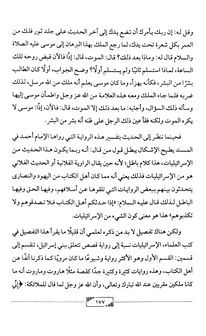 فحينما ننظر إلى الحديث بتفسير هذه الرواية التي رواها الإمام أحمد في المسند يطيح الإشكال يبطل قول من قال: أنه ربما يكون هذا الحديث من الإسرائيليات، هذا كلام باطل؛ لأنه حين يقال الراوية الفلانية أو الحديث الفلاني هو من الإسرائيليات فذلك يعني أنه مما كان أهل الكتاب من اليهود والنصارى يتحدثون بينهم ببعض الروايات التي تلقوها عن أسلافهم، وفيها الحق وفيها الباطل لذلك قال عليه السلام: «إذا حدثكم أهل الكتاب فلا تصدقوهم ولا تكذبوهم» هذا هو معنى كون الشيء من الإسرائيليات.
