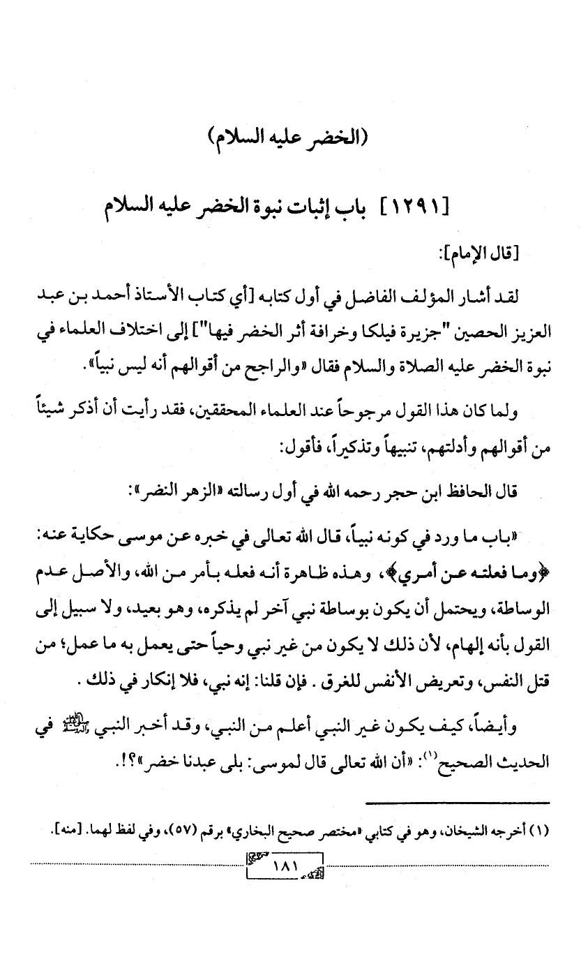 لقد أشار المؤلف الفاضل في أول كتابه [أي كتاب الأستاذ أحمد بن عبد العزيز الحصين "جزيرة فيلكا وخرافة أثر الخضر فيها"] إلى اختلاف العلماء في نبوة الخضر عليه الصلاة والسلام فقال «والراجح من أقوالهم أنه ليس نبياً».