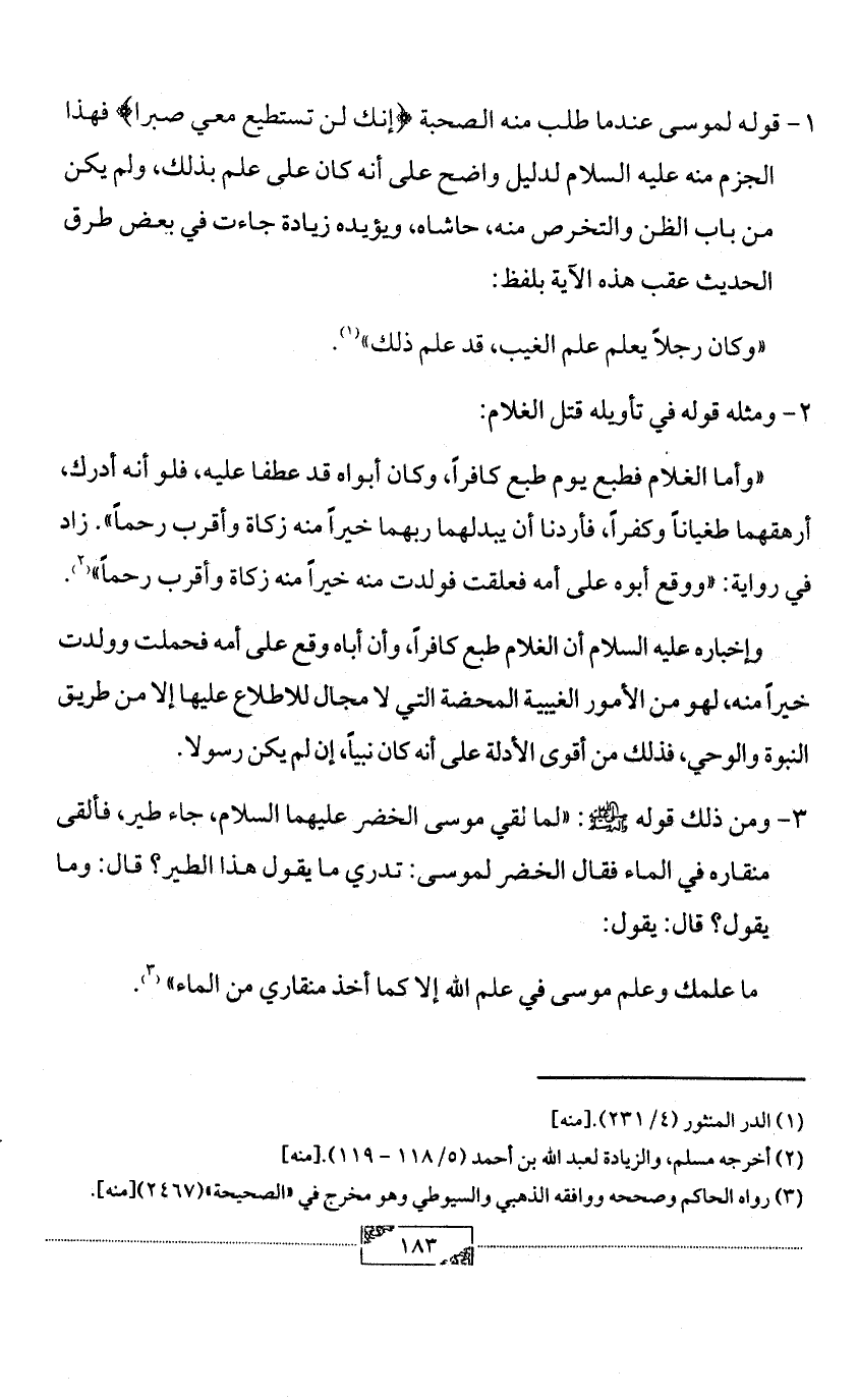 3 - ومن ذلك قوله - صلى الله عليه وآله وسلم -: «لما لقي موسى الخضر عليهما السلام، جاء طير، فألقى منقاره في الماء فقال الخضر لموسى: تدري ما يقول هذا الطير؟ قال: وما يقول؟ قال: يقول:
