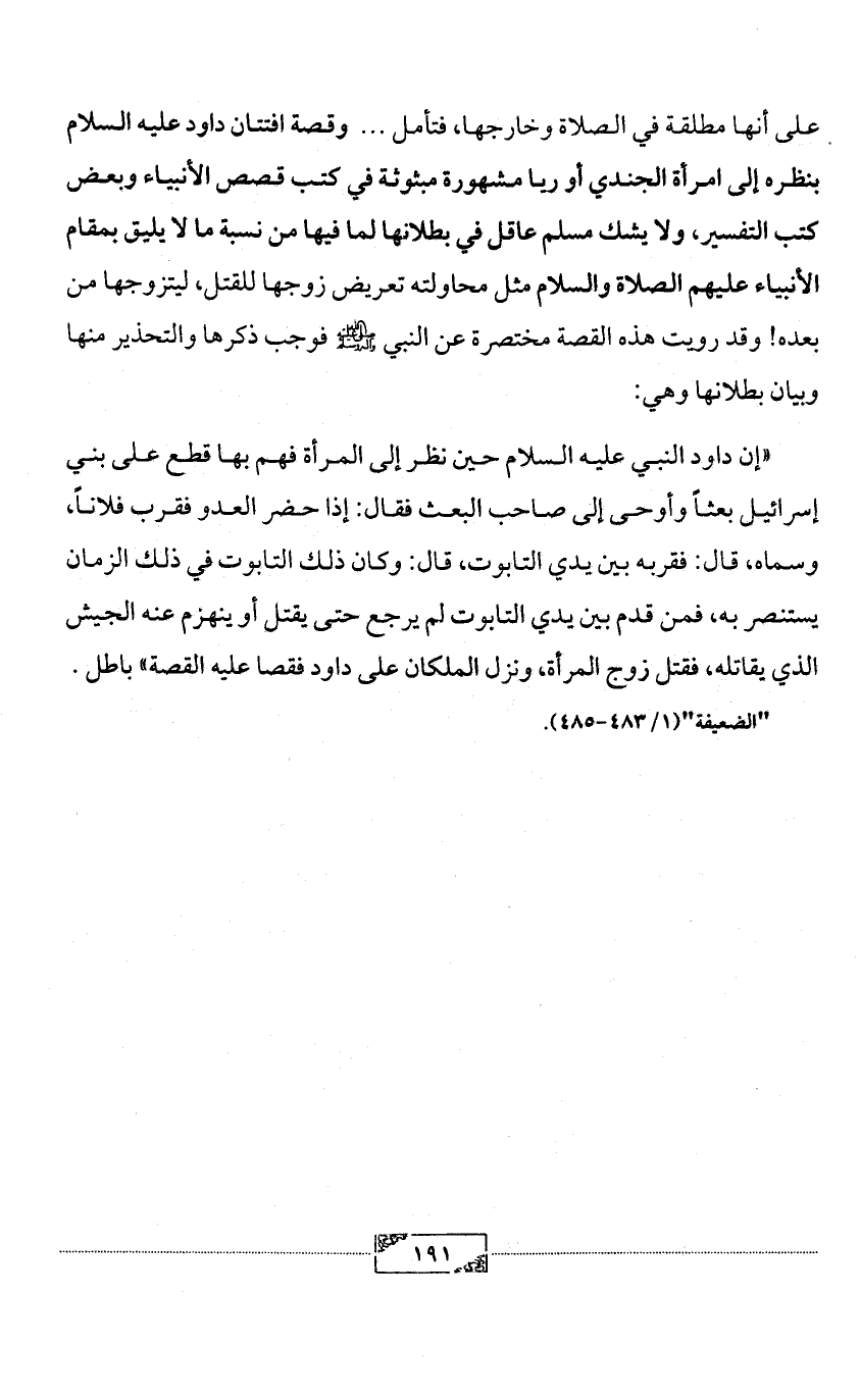 على أنها مطلقة في الصلاة وخارجها، فتأمل ... وقصة افتتان داود عليه السلام بنظره إلى امرأة الجندي أو ريا مشهورة مبثوثة في كتب قصص الأنبياء وبعض كتب التفسير، ولا يشك مسلم عاقل في بطلانها لما فيها من نسبة ما لا يليق بمقام الأنبياء عليهم الصلاة والسلام مثل محاولته تعريض زوجها للقتل، ليتزوجها من بعده! وقد رويت هذه القصة مختصرة عن النبي - صلى الله عليه وآله وسلم - فوجب ذكرها والتحذير منها وبيان بطلانها وهي: