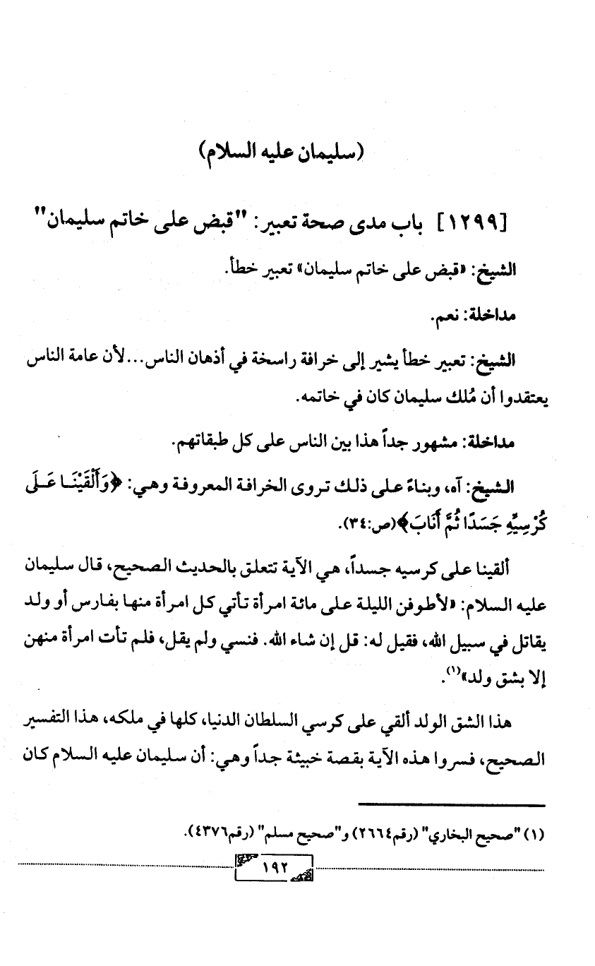 الشيخ: آه, وبناءً على ذلك تروى الخرافة المعروفة وهي: {وَأَلْقَيْنَا عَلَى كُرْسِيِّهِ جَسَدًا ثُمَّ أَنَابَ} (ص:34).