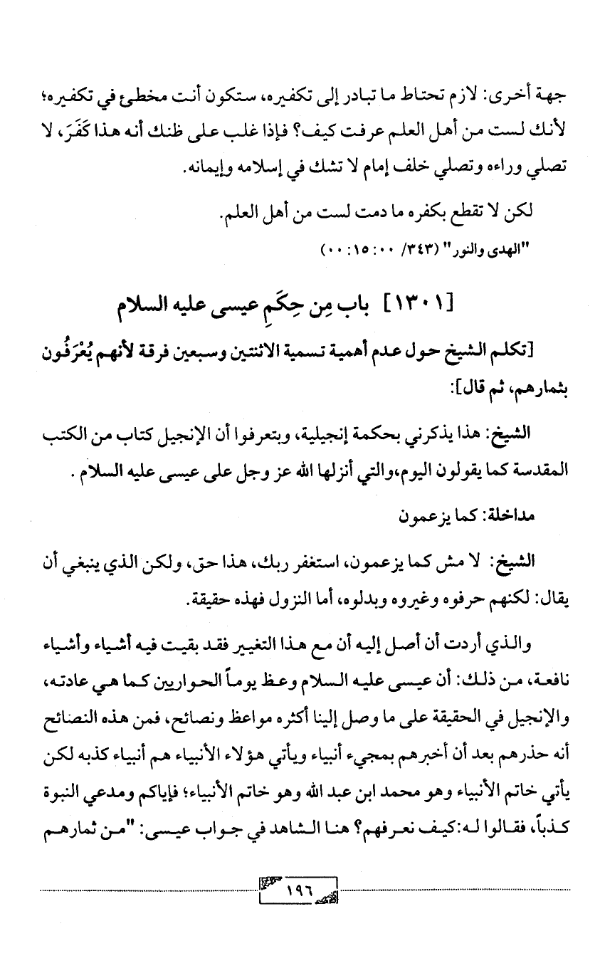 الشيخ: هذا يذكرني بحكمة إنجيلية, وبتعرفوا أن الإنجيل كتاب من الكتب المقدسة كما يقولون اليوم, والتي أنزلها الله عز وجل على عيسى عليه السلام.