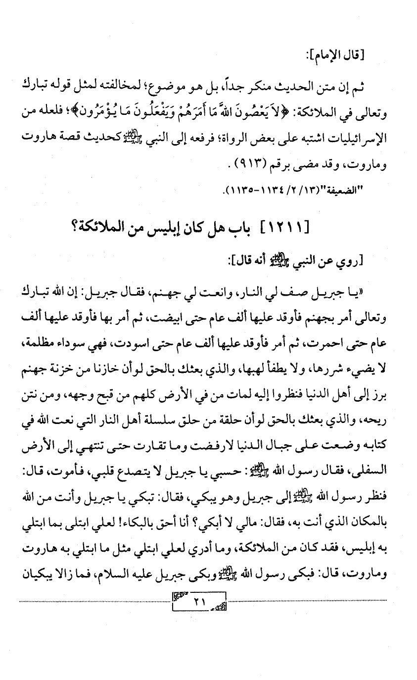 ثم إن متن الحديث منكر جداً، بل هو موضوع؛ لمخالفته لمثل قوله تبارك وتعالى في الملائكة: {لاَ يَعْصُونَ اللَّهَ مَا أَمَرَهُمْ وَيَفْعَلُونَ مَا يُؤْمَرُون}؛ فلعله من الإسرائيليات اشتبه على بعض الرواة؛ فرفعه إلى النبي - صلى الله عليه وآله وسلم - كحديث قصة هاروت وماروت، وقد مضى برقم (913).