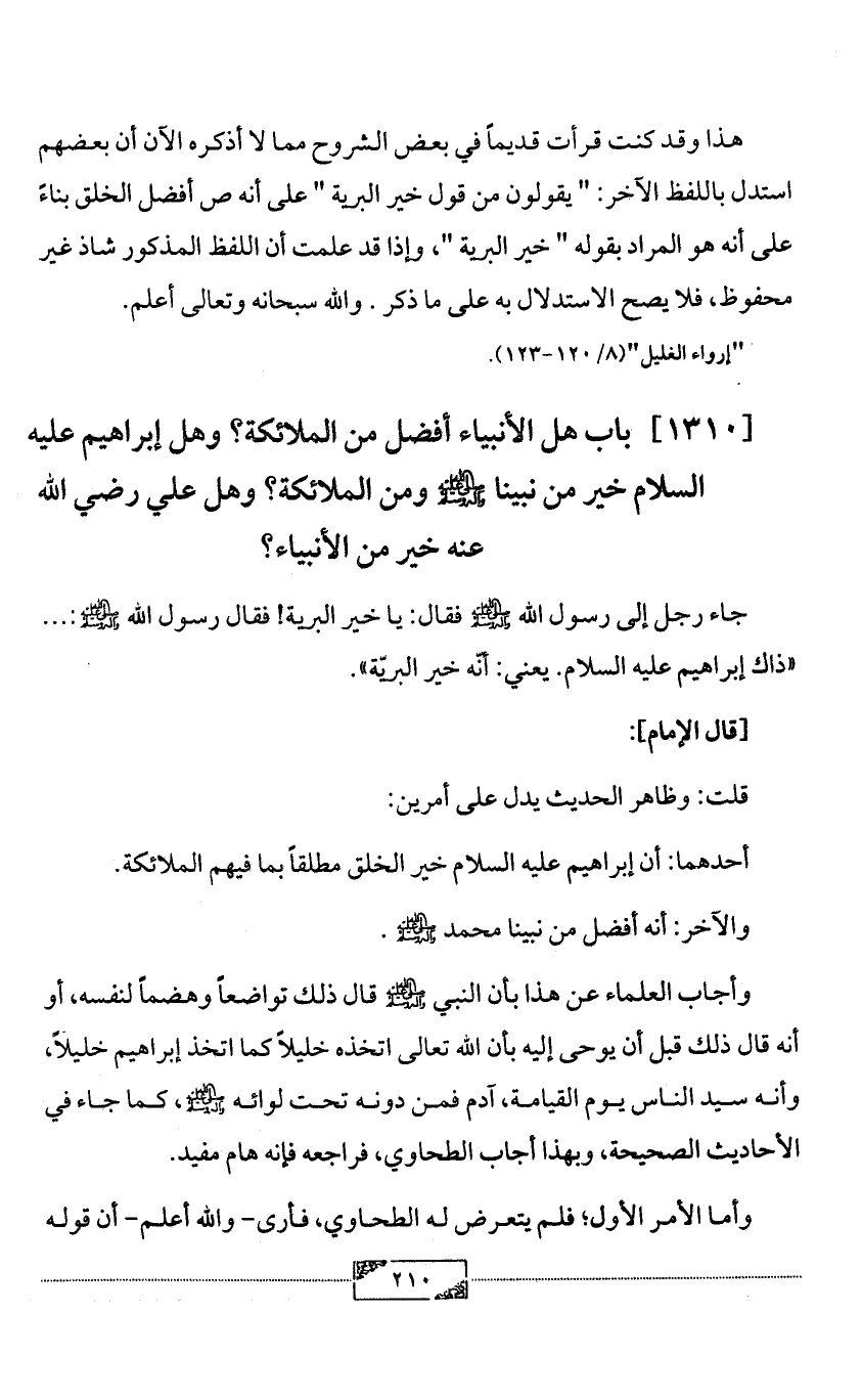 [1310] باب هل الأنبياء أفضل من الملائكة؟ وهل إبراهيم عليه السلام خير من نبينا - صلى الله عليه وآله وسلم - ومن الملائكة؟ وهل علي رضي الله عنه خير من الأنبياء؟