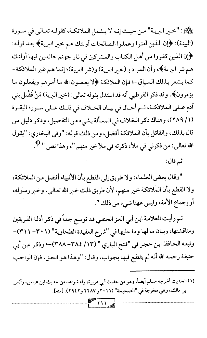 - صلى الله عليه وآله وسلم -: "خير البرية" من حيث إنه لا يشمل الملائكة، كقوله تعالى في سورة (البينة): {إن الذين آمنوا وعملوا الصالحات أولئك هم خير البرية} بعد قوله: {إن الذين كفروا من أهل الكتاب والمشركين في نار جهنم خالدين فيها أولئك هم شر البرية}، وأن المراد بـ (خير البرية) و (شر البرية)؛ إنما هم غير الملائكة- كما يشعر بذلك السياق-؛ فإن الملائكة {لا يعصون الله ما أمرهم ويفعلون ما يؤمرون}. وقد ذكر القرطبي أنه قد استدل بقوله تعالى: (خير البرية) مَنْ فَضَّل بني آدم على الملائكة، ثم أحال في بيان الخلاف في ذلك على سورة البقرة (1/ 289)، وهناك ذكر الخلاف في المسألة بشيء من التفصيل، وذكر دليل من قال بذلك، والقائل بأن الملائكة أفضل، ومن ذلك قوله: "وفي البخاري: "يقول الله تعالى: من ذكرني في ملأ، ذكرته في ملأ خير منهم "، وهذا نص " {(¬1)}.
