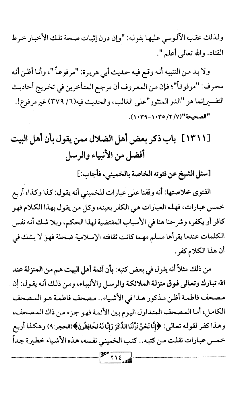 [1311] باب ذكر بعض أهل الضلال ممن يقول بأن أهل البيت أفضل من الأنبياء والرسل