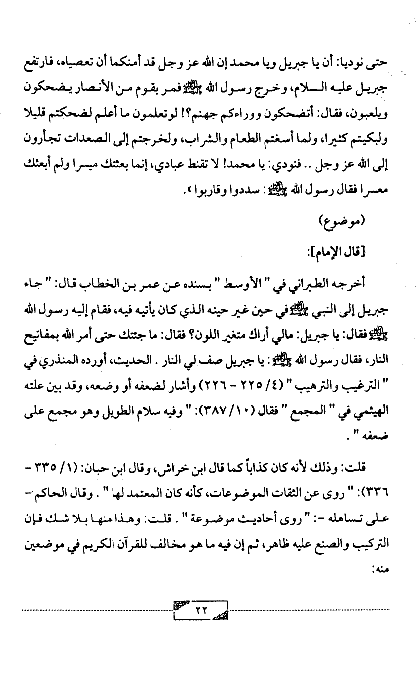 أخرجه الطبراني في " الأوسط " بسنده عن عمر بن الخطاب قال: " جاء جبريل إلى النبي - صلى الله عليه وآله وسلم - في حين غير حينه الذي كان يأتيه فيه، فقام إليه رسول الله - صلى الله عليه وآله وسلم - فقال: يا جبريل: مالي أراك متغير اللون؟ فقال: ما جئتك حتى أمر الله بمفاتيح النار، فقال رسول الله - صلى الله عليه وآله وسلم -: يا جبريل صف لي النار. الحديث، أورده المنذري في " الترغيب والترهيب " (4/ 225 - 226) وأشار لضعفه أو وضعه، وقد بين علته الهيثمي في " المجمع " فقال (10/ 387): " وفيه سلام الطويل وهو مجمع على ضعفه ".