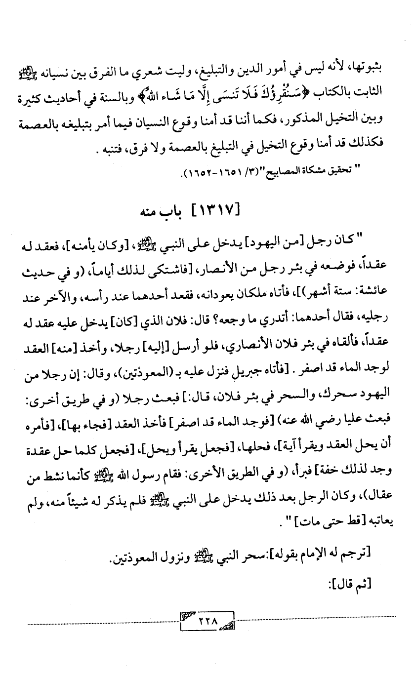 " كان رجل [من اليهود] يدخل على النبي - صلى الله عليه وآله وسلم -، [وكان يأمنه]، فعقد له عقداً، فوضعه في بئر رجل من الأنصار، [فاشتكى لذلك أياماً، (وفي حديث عائشة: ستة أشهر)]، فأتاه ملكان يعودانه، فقعد أحدهما عند رأسه، والآخر عند رجليه، فقال أحدهما: أتدري ما وجعه؟ قال: فلان الذي [كان] يدخل عليه عقد له عقداً، فألقاه في بئر فلان الأنصاري، فلو أرسل [إليه] رجلا، وأخذ [منه] العقد لوجد الماء قد اصفر. [فأتاه جبريل فنزل عليه بـ (المعوذتين)، وقال: إن رجلا من اليهود سحرك، والسحر في بئر فلان، قال:] فبعث رجلا (وفي طريق أخرى: فبعث عليا رضي الله عنه) [فوجد الماء قد اصفر] فأخذ العقد [فجاء بها]، [فأمره أن يحل العقد ويقرأ آية]، فحلها، [فجعل يقرأ ويحل]، [فجعل كلما حل عقدة وجد لذلك خفة] فبرأ، (وفي الطريق الأخرى: فقام رسول الله - صلى الله عليه وآله وسلم - كأنما نشط من عقال)، وكان الرجل بعد ذلك يدخل على النبي - صلى الله عليه وآله وسلم - فلم يذكر له شيئاً منه، ولم يعاتبه [قط حتى مات] ".