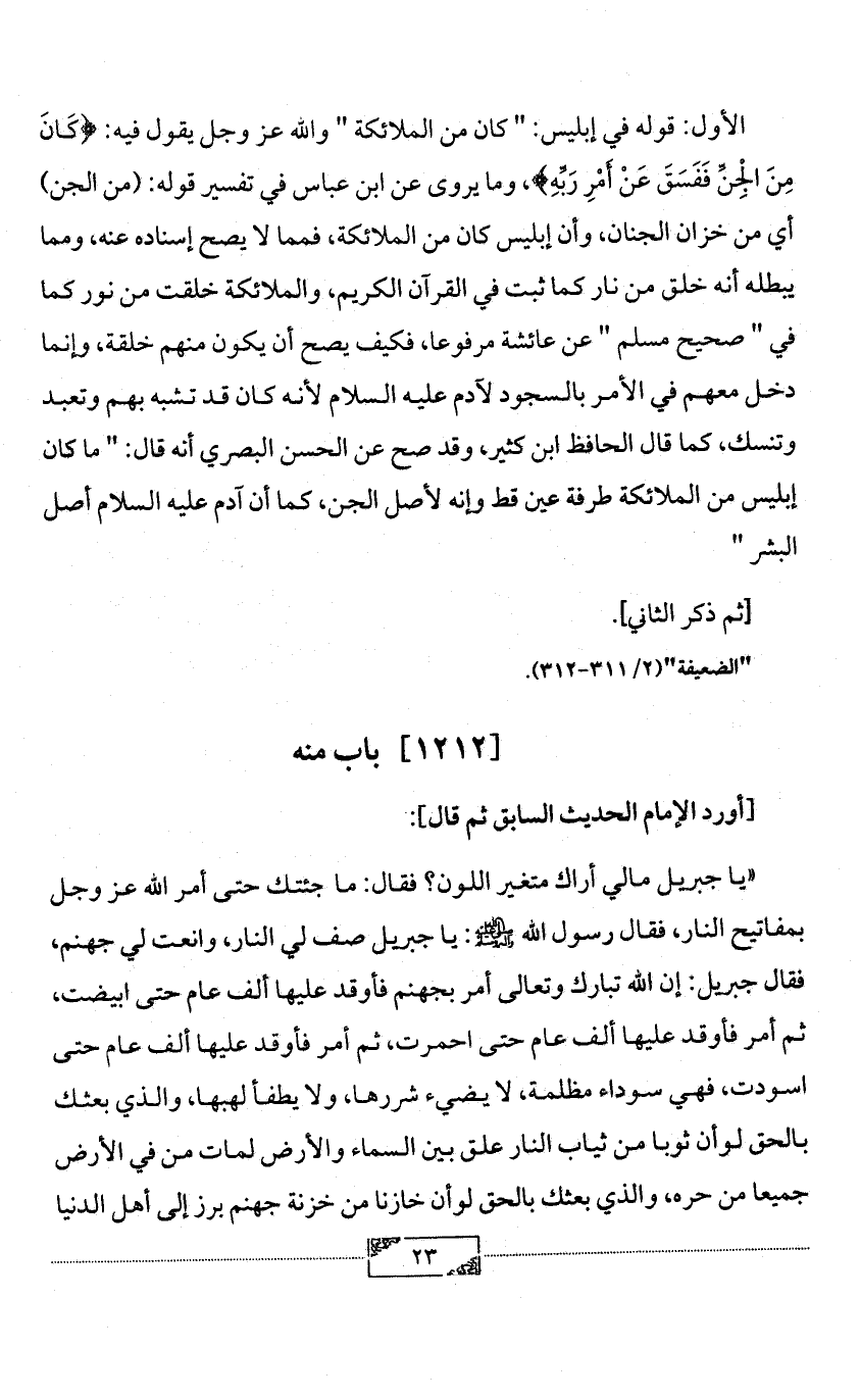 الأول: قوله في إبليس: " كان من الملائكة " والله عز وجل يقول فيه: {كَانَ مِنَ الْجِنِّ فَفَسَقَ عَنْ أَمْرِ رَبِّهِ}، وما يروى عن ابن عباس في تفسير قوله: (من الجن) أي من خزان الجنان، وأن إبليس كان من الملائكة، فمما لا يصح إسناده عنه، ومما يبطله أنه خلق من نار كما ثبت في القرآن الكريم، والملائكة خلقت من نور كما في " صحيح مسلم " عن عائشة مرفوعا، فكيف يصح أن يكون منهم خلقة، وإنما دخل معهم في الأمر بالسجود لآدم عليه السلام لأنه كان قد تشبه بهم وتعبد وتنسك، كما قال الحافظ ابن كثير، وقد صح عن الحسن البصري أنه قال: " ما كان إبليس من الملائكة طرفة عين قط وإنه لأصل الجن، كما أن آدم عليه السلام أصل البشر "