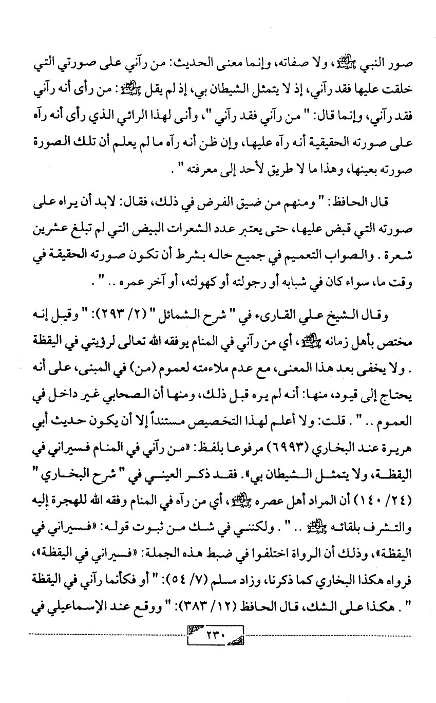 صور النبي - صلى الله عليه وآله وسلم -، ولا صفاته، وإنما معنى الحديث: من رآني على صورتي التي خلقت عليها فقد رآني، إذ لا يتمثل الشيطان بي، إذ لم يقل - صلى الله عليه وآله وسلم -: من رأى أنه رآني فقد رآني، وإنما قال: " من رآني فقد رآني "، وأنى لهذا الرائي الذي رأى أنه رآه على صورته الحقيقية أنه رآه عليها، وإن ظن أنه رآه ما لم يعلم أن تلك الصورة صورته بعينها، وهذا ما لا طريق لأحد إلى معرفته ".