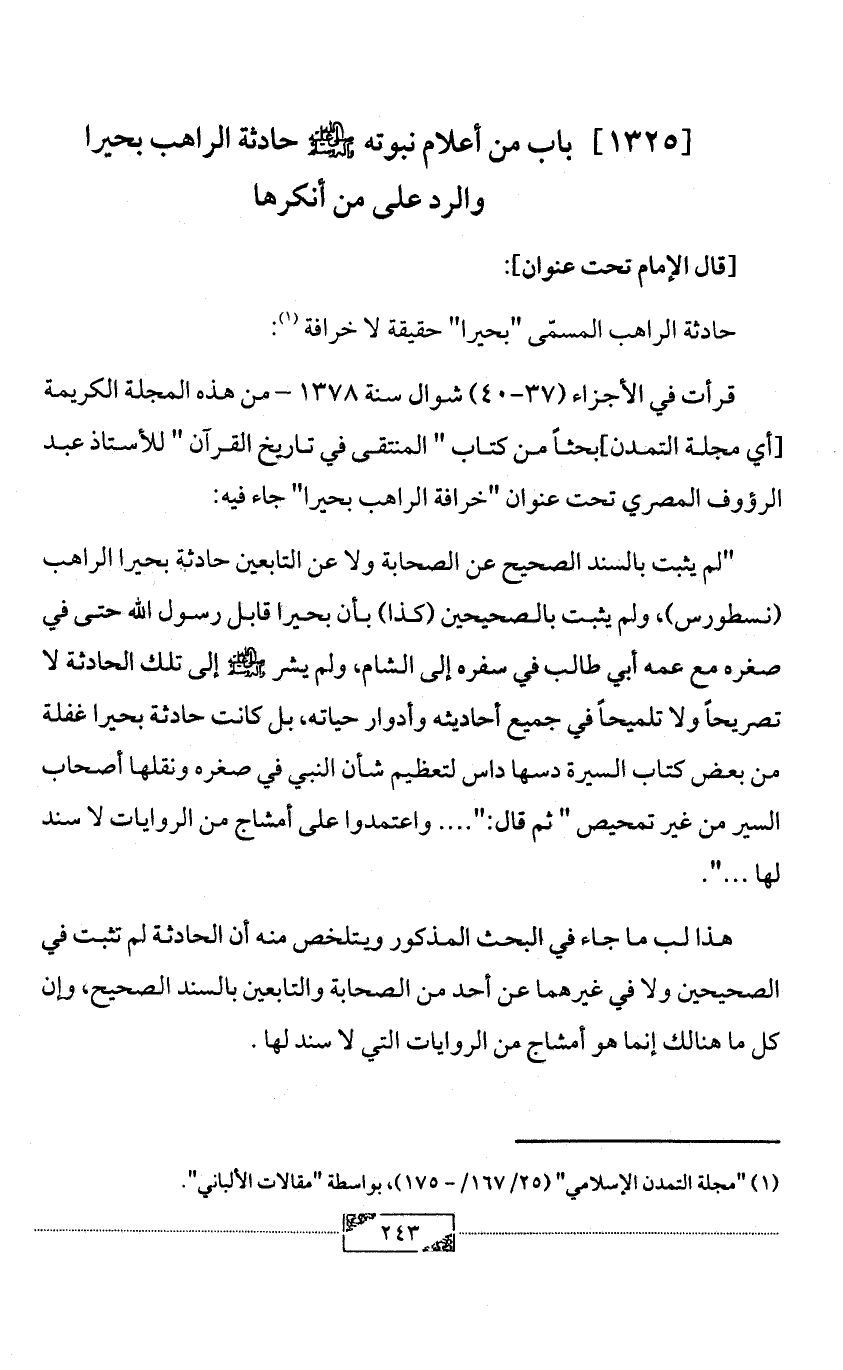 قرأت في الأجزاء (37 - 40) شوال سنة 1378 - من هذه المجلة الكريمة [أي مجلة التمدن] بحثاً من كتاب " المنتقى في تاريخ القرآن " للأستاذ عبد الرؤوف المصري تحت عنوان "خرافة الراهب بحيرا" جاء فيه: