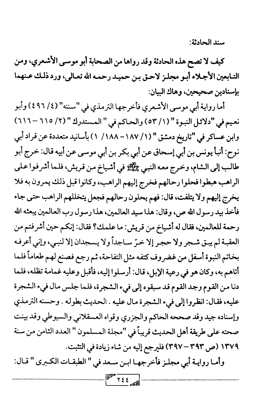 أما رواية أبي موسى الأشعري فأخرجها الترمذي في "سننه" (4/ 496) وأبو نعيم في "دلائل النبوة " (1/ 53) والحاكم في " المستدرك " (2/ 615 - 616) وابن عساكر في "تاريخ دمشق " (1/ 187 - 188/ 1) بأسانيد متعددة عن قراد أبي نوح: أنبأ يونس بن أبي إسحاق عن أبي بكر بن أبي موسى عن أبيه قال: خرج أبو طالب إلى الشام، وخرج معه النبي - صلى الله عليه وآله وسلم - في أشياخ من قريش، فلما أشرفوا على الراهب هبطوا فحلوا رحالهم فخرج إليهم الراهب، وكانوا قبل ذلك يمرون به فلا يخرج إليهم ولا يتلفت، قال: فهم يحلون رحالهم فجعل يتخللهم الراهب حتى جاء فأخذ بيد رسول الله - صلى الله عليه وسلم -، وقال: هذا سيد العالمين، هذا رسول رب العالمين يبعثه الله رحمة للعالمين، فقال له أشياخ من قريش: ما علمك؟ فقال: إنكم حين أشرفتم من العقبة لم يبق شجر ولا حجر إلا خرّ ساجداً ولا يسجدان إلا لنبي، وإني أعرفه بخاتم النبوة أسفل من غضروف كتفه مثل التفاحة، ثم رجع فصنع لهم طعاماً فلما أتاهم به، وكان هو في رعية الإبل، قال: أرسلوا إليه، فأقبل وعليه غمامة تظله، فلما دنا من القوم وجد القوم قد سبقوه إلى فيء الشجرة، فلما جلس مال فيء الشجرة عليه، فقال: انظروا إلى فيء الشجرة مال عليه. الحديث بطوله. وحسنه الترمذي وإسناده جيد وقد صححه الحاكم والجزري وقواه العسقلاني والسيوطي وقد بينت صحته على طريقة أهل الحديث قريباً في "مجلة المسلمون " العدد الثامن من سنة 1379 (ص 393 - 397) فليرجع إليه من شاء زيادة في التثبت.