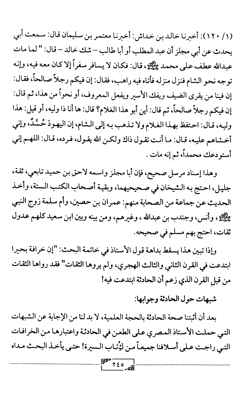 وإذا تبين هذا يسقط بداهة قول الأستاذ في خاتمة البحث: "إن خرافة بحيرا ابتدعت في القرن الثاني والثالث الهجري، ولم يروها الثقات" فقد رواها الثقات من قبل القرن الذي زعم أن الحادثة ابتدعت فيه!