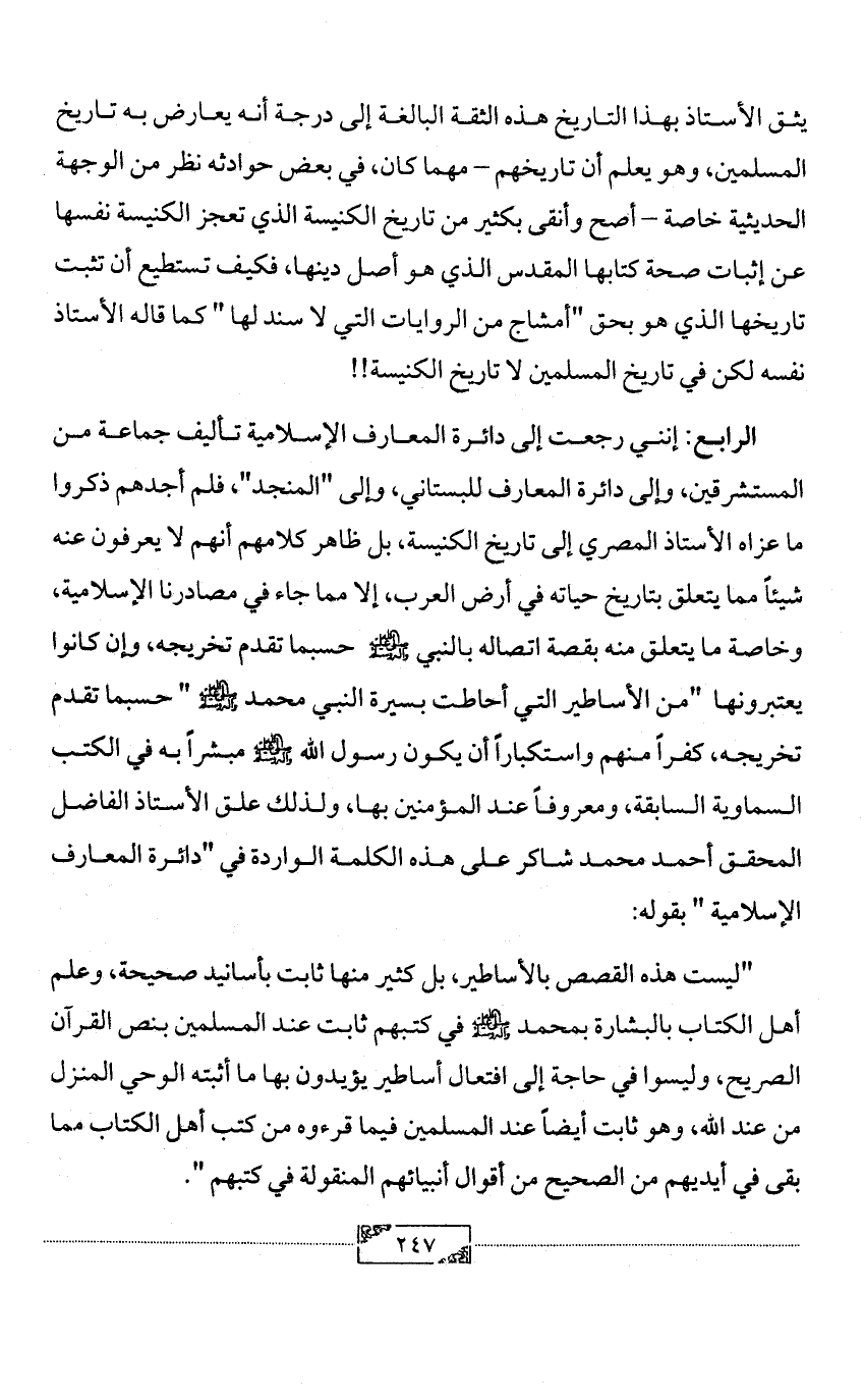 "ليست هذه القصص بالأساطير، بل كثير منها ثابت بأسانيد صحيحة، وعلم أهل الكتاب بالبشارة بمحمد - صلى الله عليه وآله وسلم - في كتبهم ثابت عند المسلمين بنص القرآن الصريح، وليسوا في حاجة إلى افتعال أساطير يؤيدون بها ما أثبته الوحي المنزل من عند الله، وهو ثابت أيضاً عند المسلمين فيما قرءوه من كتب أهل الكتاب مما بقى في أيديهم من الصحيح من أقوال أنبيائهم المنقولة في كتبهم ".