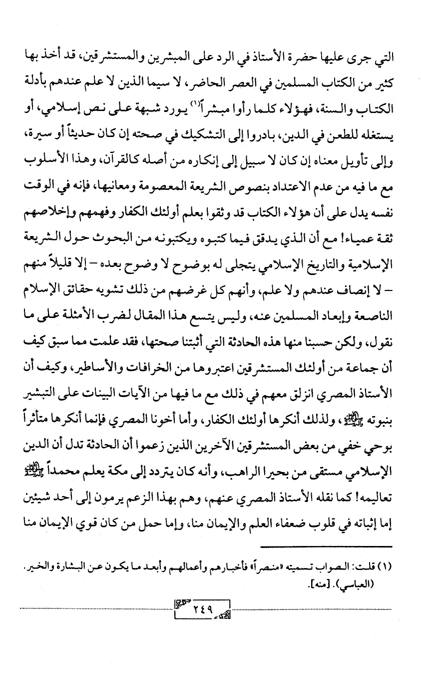 التي جرى عليها حضرة الأستاذ في الرد على المبشرين والمستشرقين، قد أخذ بها كثير من الكتاب المسلمين في العصر الحاضر، لا سيما الذين لا علم عندهم بأدلة الكتاب والسنة، فهؤلاء كلما رأوا مبشراً (¬1) يورد شبهة على نص إسلامي، أو يستغله للطعن في الدين، بادروا إلى التشكيك في صحته إن كان حديثاً أو سيرة، وإلى تأويل معناه إن كان لا سبيل إلى إنكاره من أصله كالقرآن، وهذا الأسلوب مع ما فيه من عدم الاعتداد بنصوص الشريعة المعصومة ومعانيها، فإنه في الوقت نفسه يدل على أن هؤلاء الكتاب قد وثقوا بعلم أولئك الكفار وفهمهم وإخلاصهم ثقة عمياء! مع أن الذي يدقق فيما كتبوه ويكتبونه من البحوث حول الشريعة الإسلامية والتاريخ الإسلامي يتجلى له بوضوح لا وضوح بعده - إلا قليلاً منهم - لا إنصاف عندهم ولا علم، وأنهم كل غرضهم من ذلك تشويه حقائق الإسلام الناصعة وإبعاد المسلمين عنه، وليس يتسع هذا المقال لضرب الأمثلة على ما نقول، ولكن حسبنا منها هذه الحادثة التي أثبتنا صحتها، فقد علمت مما سبق كيف أن جماعة من أولئك المستشرقين اعتبروها من الخرافات والأساطير، وكيف أن الأستاذ المصري انزلق معهم في ذلك مع ما فيها من الآيات البينات على التبشير بنبوته - صلى الله عليه وآله وسلم -، ولذلك أنكرها أولئك الكفار، وأما أخونا المصري فإنما أنكرها متأثراً بوحي خفي من بعض المستشرقين الآخرين الذين زعموا أن الحادثة تدل أن الدين الإسلامي مستقى من بحيرا الراهب، وأنه كان يتردد إلى مكة يعلم محمداً - صلى الله عليه وآله وسلم - تعاليمه! كما نقله الأستاذ المصري عنهم، وهم بهذا الزعم يرمون إلى أحد شيئين إما إثباته في قلوب ضعفاء العلم والإيمان منا، وإما حمل من كان قوي الإيمان منا