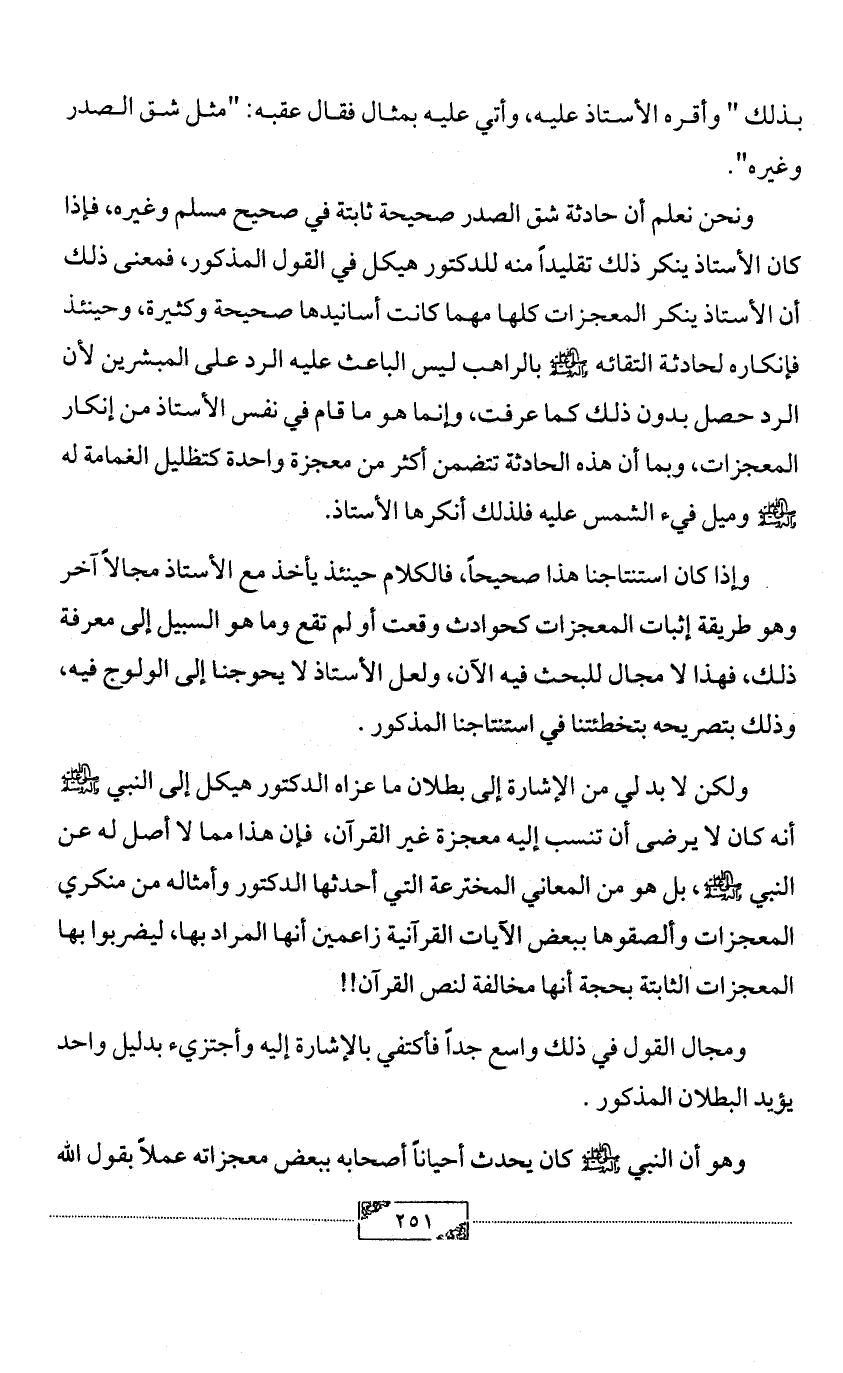 ونحن نعلم أن حادثة شق الصدر صحيحة ثابتة في صحيح مسلم وغيره، فإذا كان الأستاذ ينكر ذلك تقليداً منه للدكتور هيكل في القول المذكور، فمعنى ذلك أن الأستاذ ينكر المعجزات كلها مهما كانت أسانيدها صحيحة وكثيرة، وحينئذ فإنكاره لحادثة التقائه - صلى الله عليه وآله وسلم - بالراهب ليس الباعث عليه الرد على المبشرين لأن الرد حصل بدون ذلك كما عرفت، وإنما هو ما قام في نفس الأستاذ من إنكار المعجزات، وبما أن هذه الحادثة تتضمن أكثر من معجزة واحدة كتظليل الغمامة له - صلى الله عليه وآله وسلم - وميل فيء الشمس عليه فلذلك أنكرها الأستاذ.
