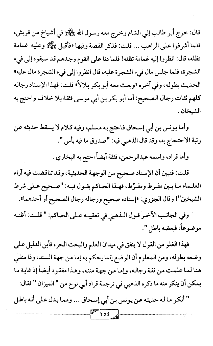 قال: خرج أبو طالب إلي الشام وخرج معه رسول الله - صلى الله عليه وآله وسلم - في أشياخ من قريش، فلما أشرفوا على الراهب ... قلت: فذكر القصة وفيها «فأقبل - صلى الله عليه وآله وسلم - وعليه غمامة تظله، قال: انظروا إليه غمامة تظله! فلما دنا على القوم وجدهم قد سبقوه إلى فيء الشجرة، فلما جلس مال فيء الشجرة عليه، قال انظروا إلى فيء الشجرة مال عليه» الحديث بطوله، وفي آخره «وبعث معه أبو بكر بلالاً» قلت: فهذا الإسناد رجاله كلهم ثقات رجال الصحيح: أما أبو بكر بن أبي موسى فثقة بلا خلاف واحتج به الشيخان.