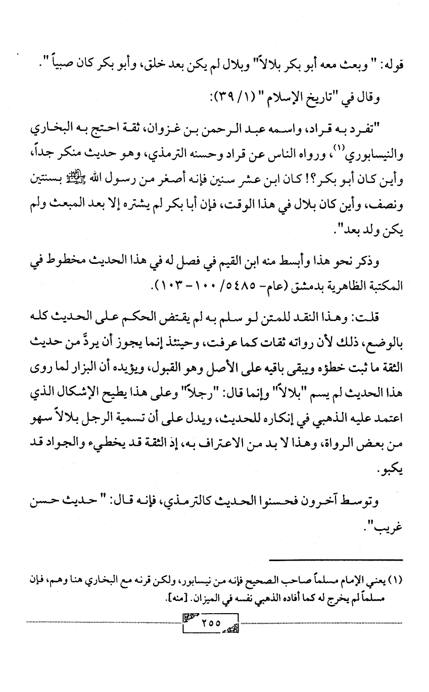 "تفرد به قراد، واسمه عبد الرحمن بن غزوان، ثقة احتج به البخاري والنيسابوري (¬1)، ورواه الناس عن قراد وحسنه الترمذي، وهو حديث منكر جداً، وأين كان أبو بكر؟! كان ابن عشر سنين فإنه أصغر من رسول الله - صلى الله عليه وآله وسلم - بسنتين ونصف، وأين كان بلال في هذا الوقت، فإن أبا بكر لم يشتره إلا بعد المبعث ولم يكن ولد بعد".