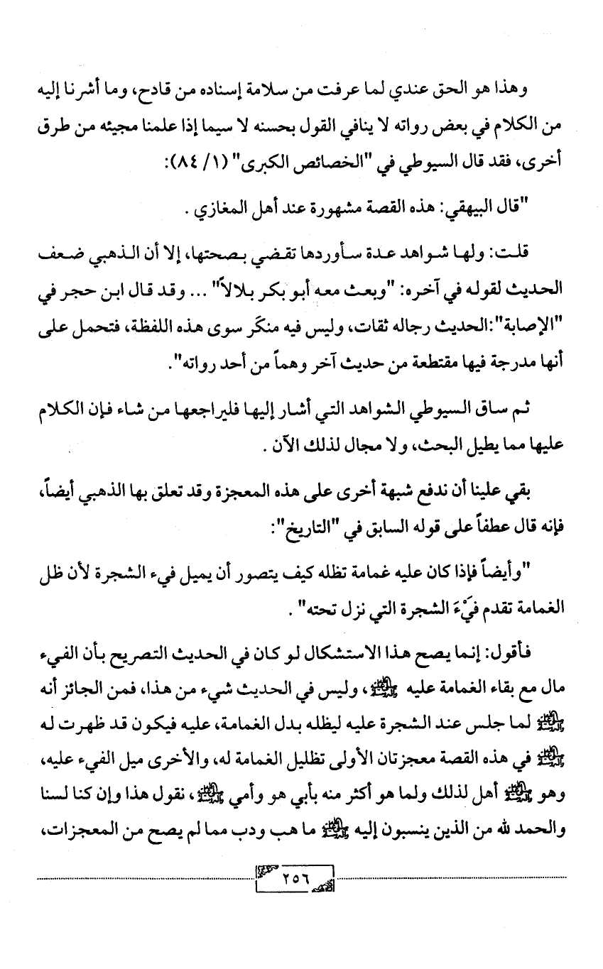 فأقول: إنما يصح هذا الاستشكال لو كان في الحديث التصريح بأن الفيء مال مع بقاء الغمامة عليه - صلى الله عليه وآله وسلم -، وليس في الحديث شيء من هذا، فمن الجائز أنه - صلى الله عليه وآله وسلم - لما جلس عند الشجرة عليه ليظله بدل الغمامة، عليه فيكون قد ظهرت له - صلى الله عليه وآله وسلم - في هذه القصة معجزتان الأولى تظليل الغمامة له، والأخرى ميل الفيء عليه، وهو - صلى الله عليه وآله وسلم - أهل لذلك ولما هو أكثر منه بأبي هو وأمي - صلى الله عليه وآله وسلم -، نقول هذا وإن كنا لسنا والحمد لله من الذين ينسبون إليه - صلى الله عليه وآله وسلم - ما هب ودب مما لم يصح من المعجزات،