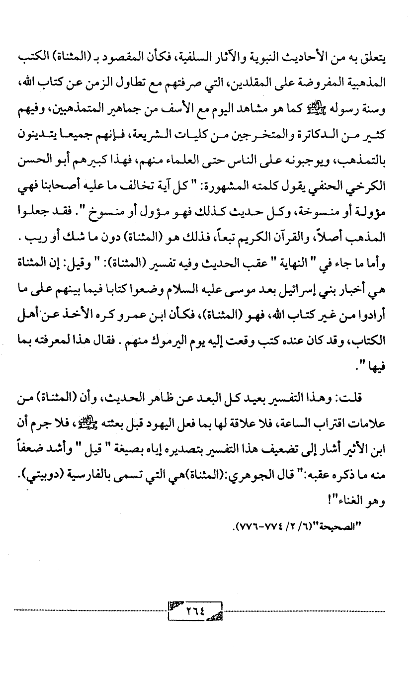 يتعلق به من الأحاديث النبوية والآثار السلفية، فكأن المقصود بـ (المثناة) الكتب المذهبية المفروضة على المقلدين، التي صرفتهم مع تطاول الزمن عن كتاب الله، وسنة رسوله - صلى الله عليه وآله وسلم - كما هو مشاهد اليوم مع الأسف من جماهير المتمذهبين، وفيهم كثير من الدكاترة والمتخرجين من كليات الشريعة، فإنهم جميعا يتدينون بالتمذهب، ويوجبونه على الناس حتى العلماء منهم، فهذا كبيرهم أبو الحسن الكرخي الحنفي يقول كلمته المشهورة: " كل آية تخالف ما عليه أصحابنا فهي مؤولة أو منسوخة، وكل حديث كذلك فهو مؤول أو منسوخ ". فقد جعلوا المذهب أصلاً، والقرآن الكريم تبعاً، فذلك هو (المثناة) دون ما شك أو ريب. وأما ما جاء في " النهاية " عقب الحديث وفيه تفسير (المثناة): " وقيل: إن المثناة هي أخبار بني إسرائيل بعد موسى عليه السلام وضعوا كتابا فيما بينهم على ما أرادوا من غير كتاب الله، فهو (المثناة)، فكأن ابن عمرو كره الأخذ عن أهل الكتاب، وقد كان عنده كتب وقعت إليه يوم اليرموك منهم. فقال هذا لمعرفته بما فيها ".