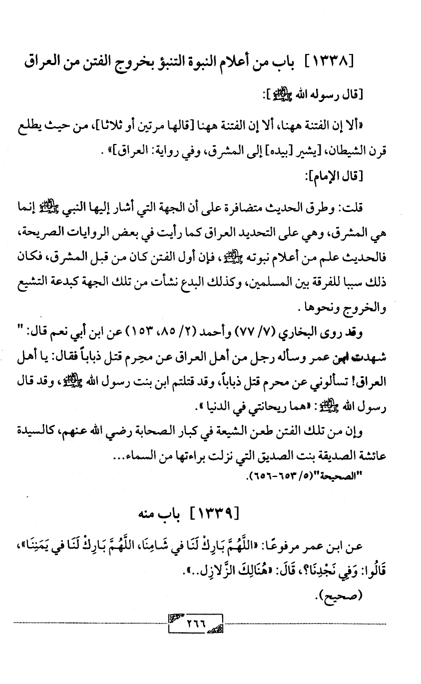 «ألا إن الفتنة ههنا، ألا إن الفتنة ههنا [قالها مرتين أو ثلاثا]، من حيث يطلع قرن الشيطان، [يشير [بيده] إلى المشرق، وفي رواية: العراق]».