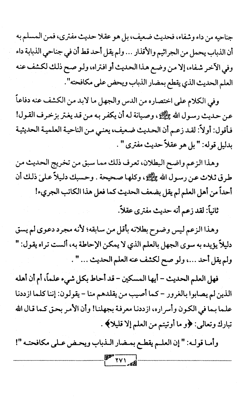 جناحيه من داء وشفاء، فحديث ضعيف، بل هو عقلا حديث مفترى، فمن المسلم به أن الذباب يحمل من الجراثيم والأقذار ... ولم يقل أحد قط أن في جناحي الذبابة داء وفي الآخر شفاء، إلا من وضع هذا الحديث أو افتراه، ولو صح ذلك لكشف عنه العلم الحديث الذي يقطع بمضار الذباب ويحض على مكافحته".
