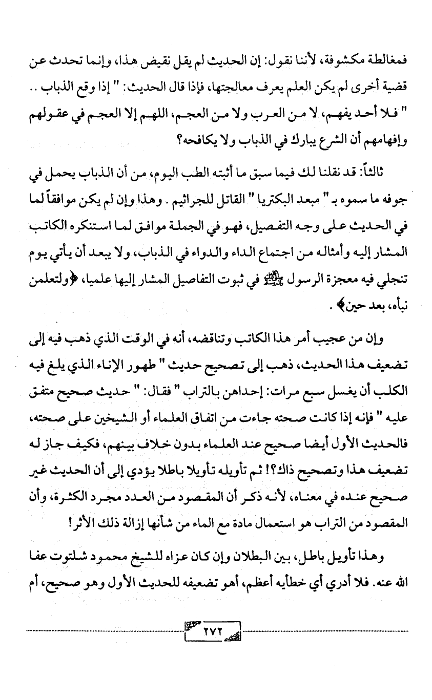 وإن من عجيب أمر هذا الكاتب وتناقضه، أنه في الوقت الذي ذهب فيه إلى تضعيف هذا الحديث، ذهب إلى تصحيح حديث " طهور الإناء الذي يلغ فيه الكلب أن يغسل سبع مرات: إحداهن بالتراب " فقال: " حديث صحيح متفق عليه " فإنه إذا كانت صحته جاءت من اتفاق العلماء أو الشيخين على صحته، فالحديث الأول أيضا صحيح عند العلماء بدون خلاف بينهم، فكيف جاز له تضعيف هذا وتصحيح ذاك؟! ثم تأويله تأويلا باطلا يؤدي إلى أن الحديث غير صحيح عنده في معناه، لأنه ذكر أن المقصود من العدد مجرد الكثرة، وأن المقصود من التراب هو استعمال مادة مع الماء من شأنها إزالة ذلك الأثر!