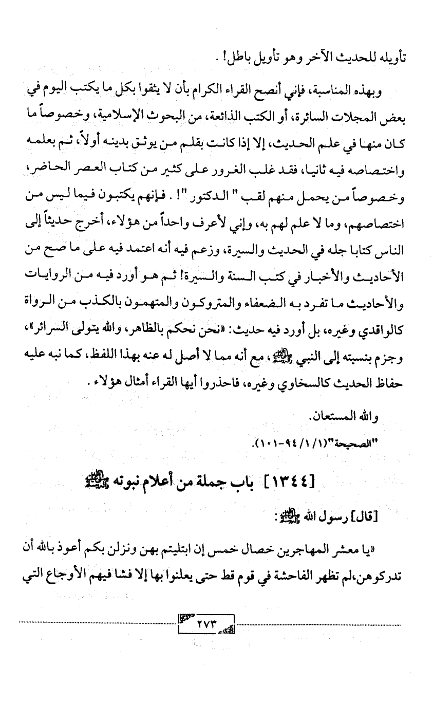 وبهذه المناسبة، فإني أنصح القراء الكرام بأن لا يثقوا بكل ما يكتب اليوم في بعض المجلات السائرة، أو الكتب الذائعة، من البحوث الإسلامية، وخصوصاً ما كان منها في علم الحديث، إلا إذا كانت بقلم من يوثق بدينه أولاً، ثم بعلمه واختصاصه فيه ثانيا، فقد غلب الغرور على كثير من كتاب العصر الحاضر، وخصوصاً من يحمل منهم لقب " الدكتور "!. فإنهم يكتبون فيما ليس من اختصاصهم، وما لا علم لهم به، وإني لأعرف واحداً من هؤلاء، أخرج حديثاً إلى الناس كتابا جله في الحديث والسيرة، وزعم فيه أنه اعتمد فيه على ما صح من الأحاديث والأخبار في كتب السنة والسيرة! ثم هو أورد فيه من الروايات والأحاديث ما تفرد به الضعفاء والمتروكون والمتهمون بالكذب من الرواة كالواقدي وغيره، بل أورد فيه حديث: «نحن نحكم بالظاهر، والله يتولى السرائر»، وجزم بنسبته إلى النبي - صلى الله عليه وآله وسلم -، مع أنه مما لا أصل له عنه بهذا اللفظ، كما نبه عليه حفاظ الحديث كالسخاوي وغيره، فاحذروا أيها القراء أمثال هؤلاء.