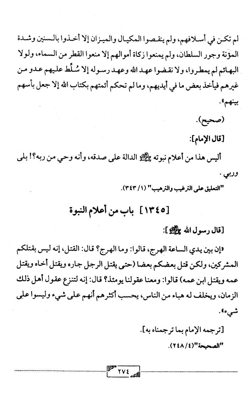 «إن بين يدي الساعة الهرج، قالوا: وما الهرج؟ قال: القتل، إنه ليس بقتلكم المشركين، ولكن قتل بعضكم بعضا (حتى يقتل الرجل جاره ويقتل أخاه ويقتل عمه ويقتل ابن عمه) قالوا: ومعنا عقولنا يومئذ؟ قال: إنه لتنزع عقول أهل ذلك الزمان، ويخلف له هباء من الناس، يحسب أكثرهم أنهم على شيء وليسوا على شيء».