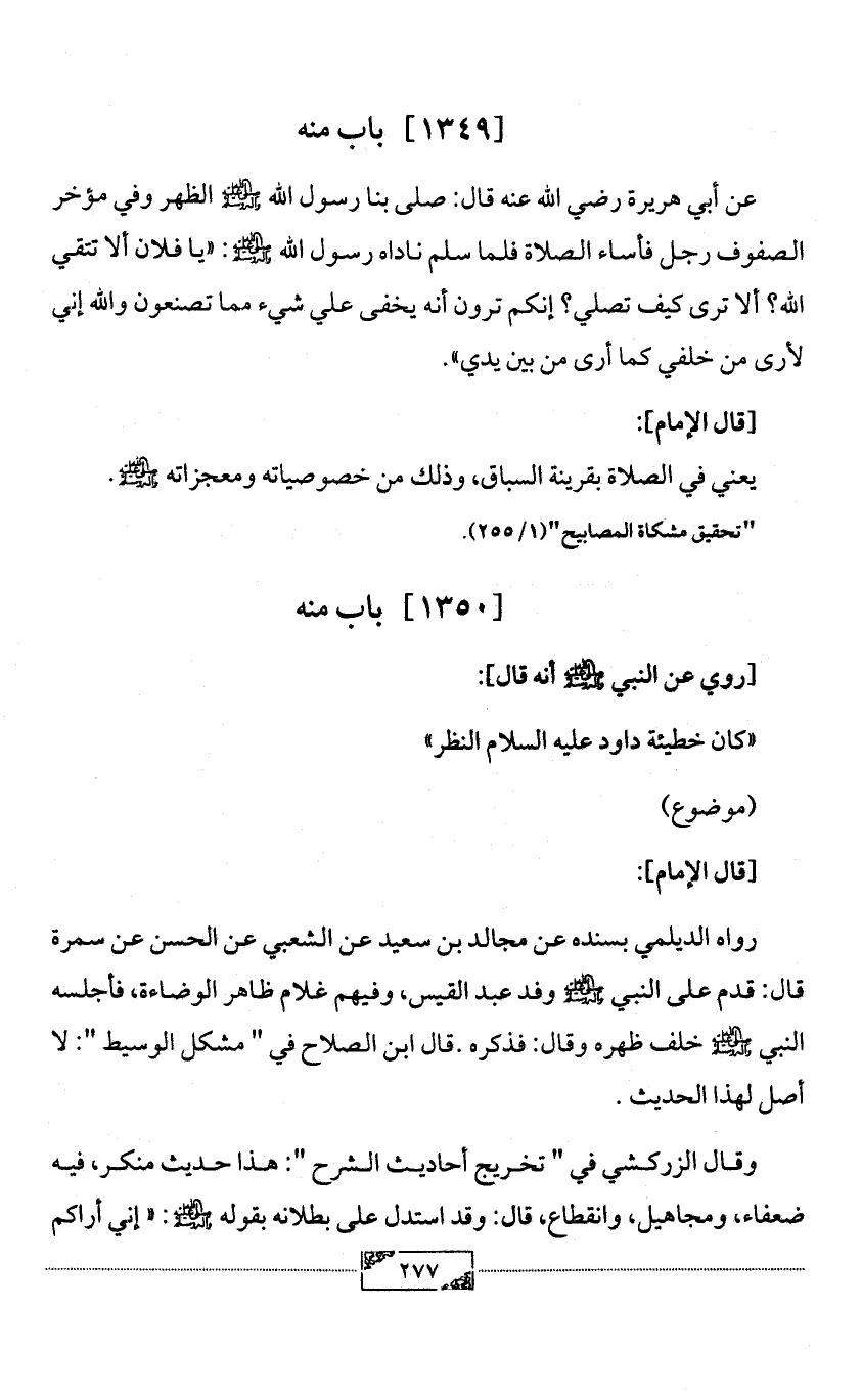عن أبي هريرة رضي الله عنه قال: صلى بنا رسول الله - صلى الله عليه وآله وسلم - الظهر وفي مؤخر الصفوف رجل فأساء الصلاة فلما سلم ناداه رسول الله - صلى الله عليه وآله وسلم -: «يا فلان ألا تتقي الله؟ ألا ترى كيف تصلي؟ إنكم ترون أنه يخفى علي شيء مما تصنعون والله إني لأرى من خلفي كما أرى من بين يدي».