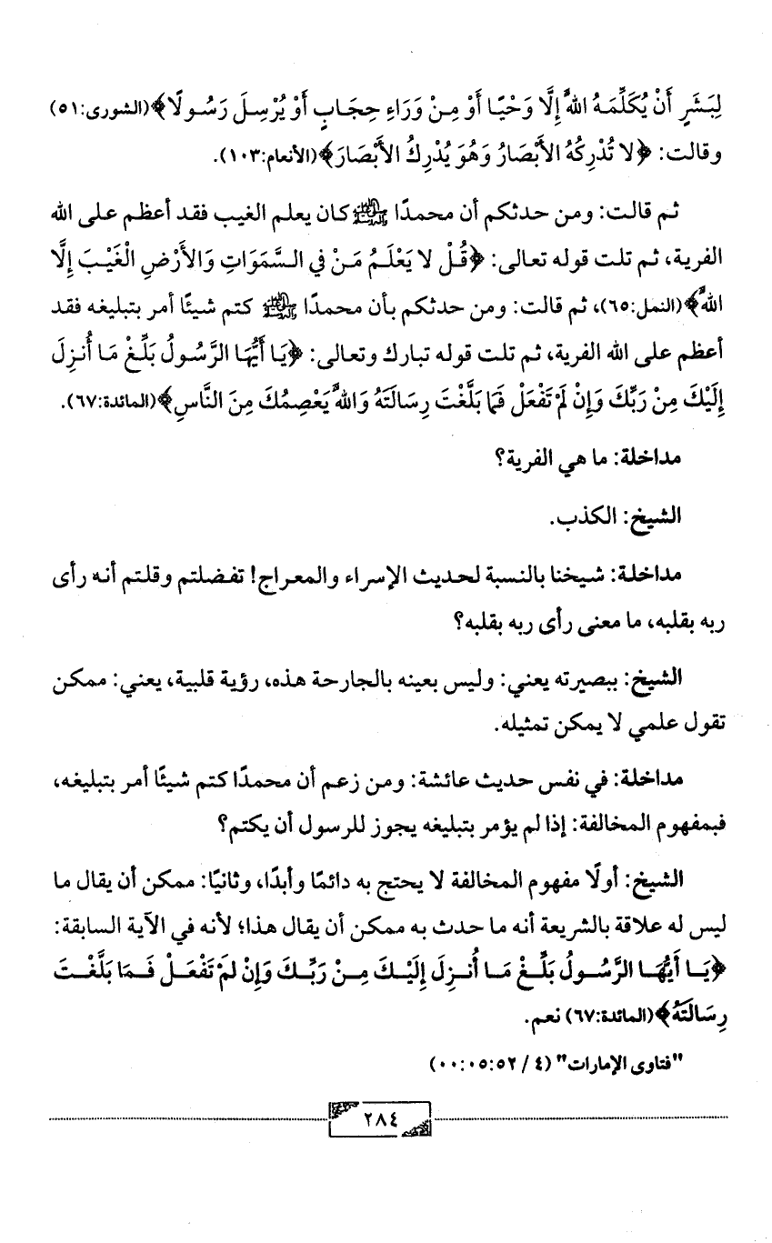 الشيخ: أولًا مفهوم المخالفة لا يحتج به دائمًا وأبدًا، وثانيًا: ممكن أن يقال ما ليس له علاقة بالشريعة أنه ما حدث به ممكن أن يقال هذا؛ لأنه في الآية السابقة: {يَا أَيُّهَا الرَّسُولُ بَلِّغْ مَا أُنزِلَ إِلَيْكَ مِنْ رَبِّكَ وَإِنْ لَمْ تَفْعَلْ فَمَا بَلَّغْتَ رِسَالَتَهُ} (المائدة:67) نعم.