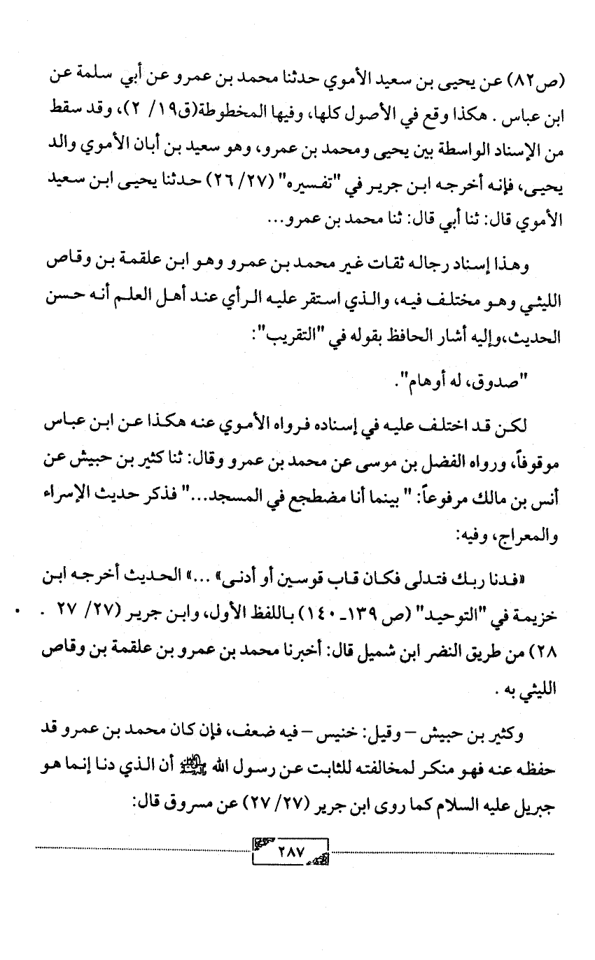 (ص82) عن يحيى بن سعيد الأموي حدثنا محمد بن عمرو عن أبي سلمة عن ابن عباس. هكذا وقع في الأصول كلها، وفيها المخطوطة (ق19/ 2)، وقد سقط من الإسناد الواسطة بين يحيى ومحمد بن عمرو، وهو سعيد بن أبان الأموي والد يحيى، فإنه أخرجه ابن جرير في "تفسيره" (27/ 26) حدثنا يحيى ابن سعيد الأموي قال: ثنا أبي قال: ثنا محمد بن عمرو ...