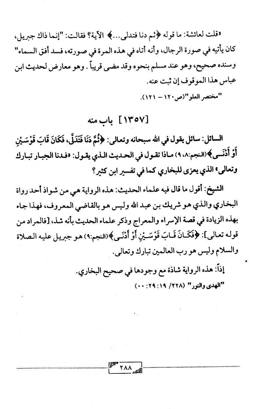 الشيخ: أقول ما قال فيه علماء الحديث: هذه الرواية هي من شواذ أحد رواة البخاري والذي هو شريك بن عبد الله وليس هو بالقاضي المعروف، فهذا جاء بهذه الزيادة في قصة الإسراء والمعراج وذكر علماء الحديث بأنه شذ، [فالمراد من قوله تعالى]: {فَكَانَ قَابَ قَوْسَيْنِ أَوْ أَدْنَى} (النجم:9) هو جبريل عليه الصلاة والسلام وليس هو رب العالمين تبارك وتعالى.
