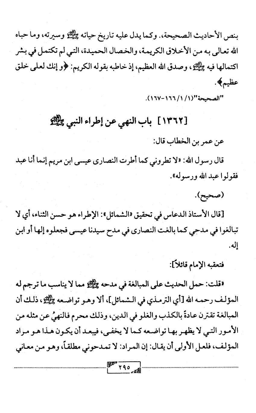 [قال الأستاذ الدعاس في تحقيق «الشمائل»: الإطراء هو حسن الثناء، أي لا تبالغوا في مدحي كما بالغت النصارى في مدح سيدنا عيسى فجعلوه إلها أو ابن إله.