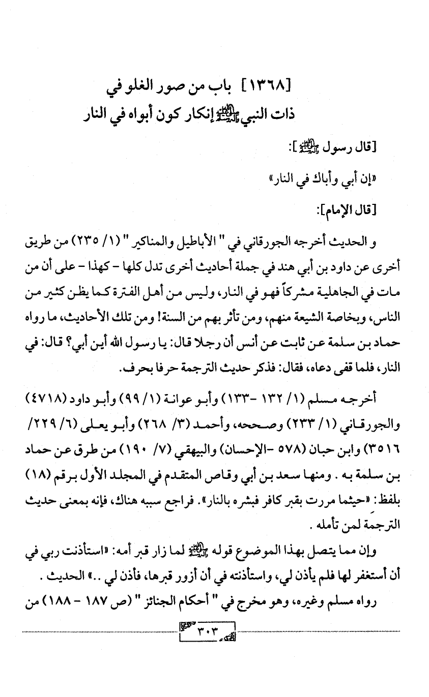 [1368] باب من صور الغلو في ذات النبي - صلى الله عليه وآله وسلم - إنكار كون أبواه في النار
