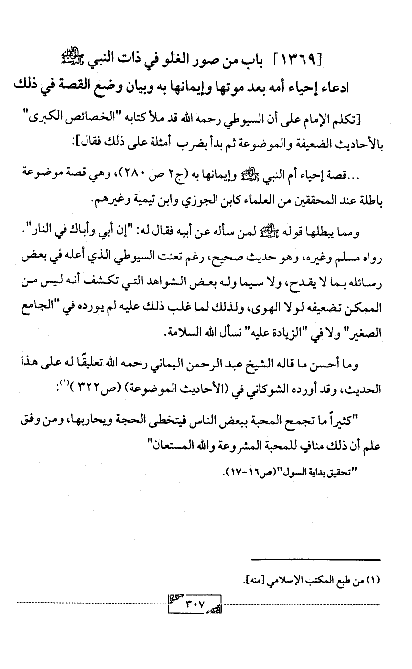 ومما يبطلها قوله - صلى الله عليه وآله وسلم - لمن سأله عن أبيه فقال له: "إن أبي وأباك في النار". رواه مسلم وغيره, وهو حديث صحيح, رغم تعنت السيوطي الذي أعله في بعض رسائله بما لا يقدح, ولا سيما وله بعض الشواهد التي تكشف أنه ليس من الممكن تضعيفه لولا الهوى, ولذلك لما غلب ذلك عليه لم يورده في "الجامع الصغير" ولا في "الزيادة عليه" نسأل الله السلامة.