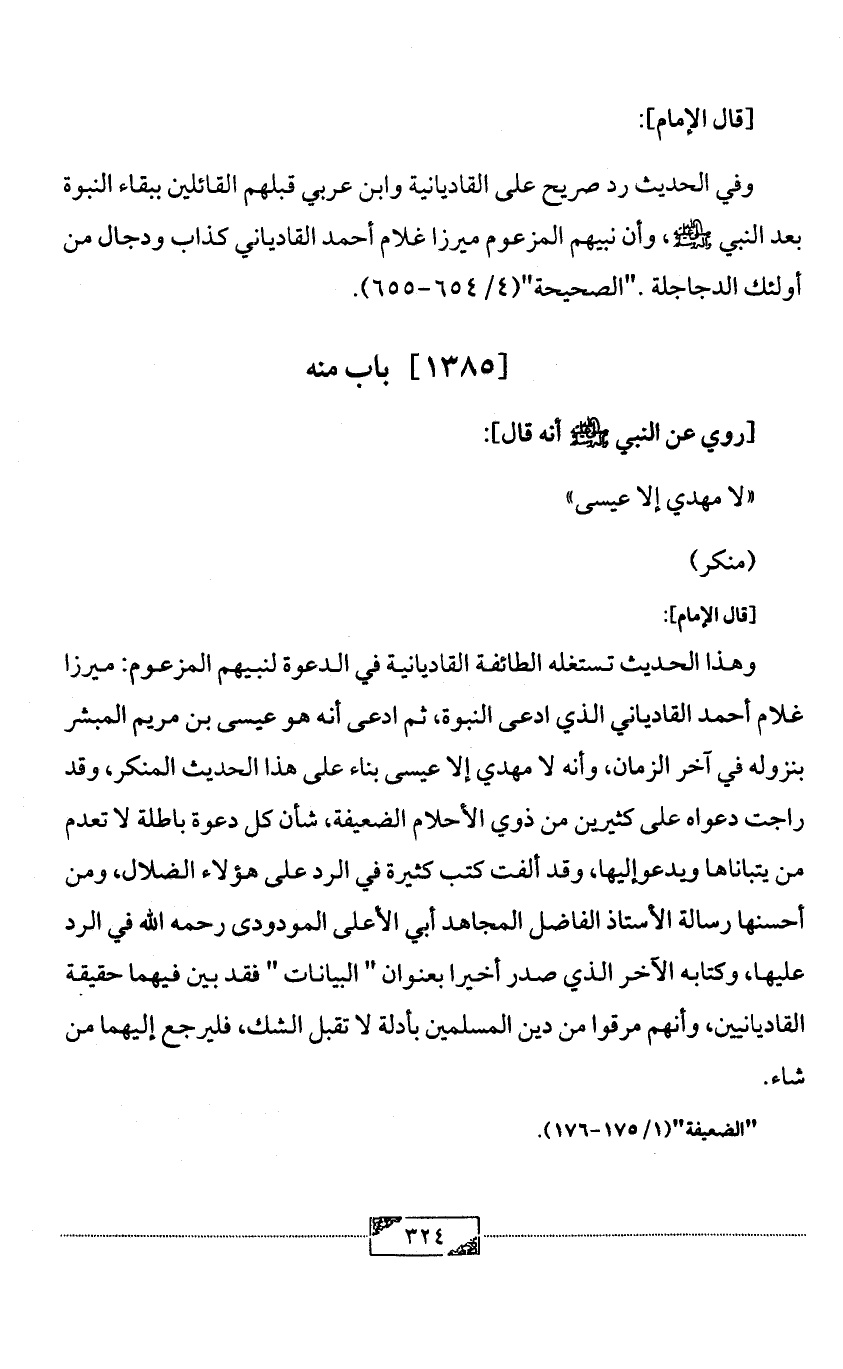 وفي الحديث رد صريح على القاديانية وابن عربي قبلهم القائلين ببقاء النبوة بعد النبي - صلى الله عليه وآله وسلم -، وأن نبيهم المزعوم ميرزا غلام أحمد القادياني كذاب ودجال من أولئك الدجاجلة."الصحيحة" (4/ 654 - 655).