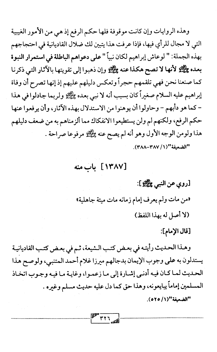وهذه الروايات وإن كانت موقوفة فلها حكم الرفع إذ هي من الأمور الغيبية التي لا مجال للرأي فيها، فإذا عرفت هذا يتبين لك ضلال القاديانية في احتجاجهم بهذه الجملة: " لوعاش إبراهيم لكان نبياً " على دعواهم الباطلة في استمرار النبوة بعده - صلى الله عليه وآله وسلم - لأنها لا تصح هكذا عنه - صلى الله عليه وآله وسلم - وإن ذهبوا إلى تقويتها بالآثار التي ذكرنا كما صنعنا نحن فهي تلقمهم حجراً وتعكس دليلهم عليهم إذ إنها تصرح أن وفاة إبراهيم عليه السلام صغيراً كان بسبب أنه لا نبي بعده - صلى الله عليه وآله وسلم - ولربما جادلوا في هذا - كما هو دأبهم - وحاولوا أن يوهنوا من الاستدلال بهذه الآثار، وأن يرفعوا عنها حكم الرفع، ولكنهم لم ولن يستطيعوا الانفكاك مما ألزمناهم به من ضعف دليلهم هذا ولومن الوجه الأول وهو أنه لم يصح عنه - صلى الله عليه وآله وسلم - مرفوعا صراحة.