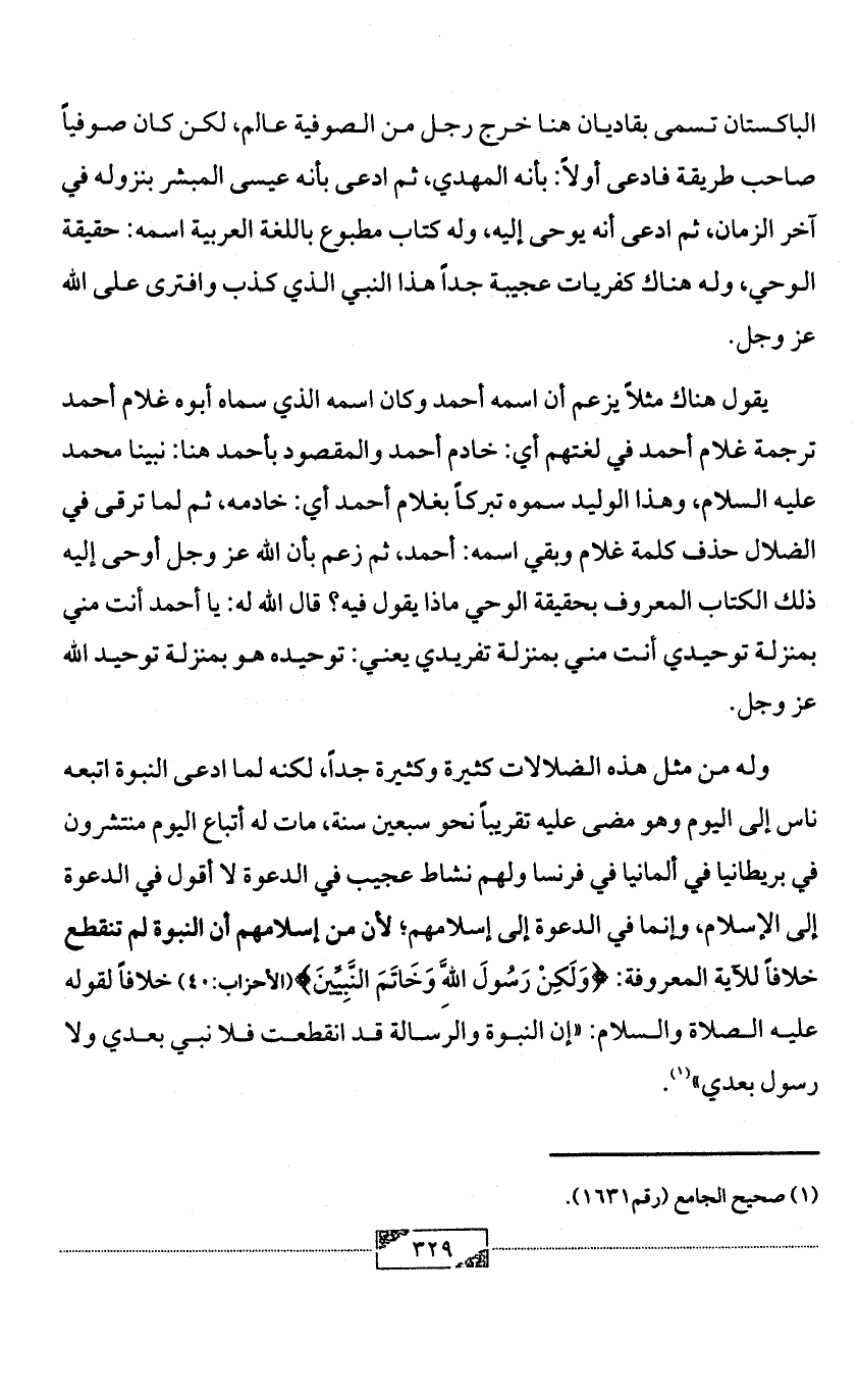 وله من مثل هذه الضلالات كثيرة وكثيرة جداً، لكنه لما ادعى النبوة اتبعه ناس إلى اليوم وهو مضى عليه تقريباً نحو سبعين سنة، مات له أتباع اليوم منتشرون في بريطانيا في ألمانيا في فرنسا ولهم نشاط عجيب في الدعوة لا أقول في الدعوة إلى الإسلام، وإنما في الدعوة إلى إسلامهم؛ لأن من إسلامهم أن النبوة لم تنقطع خلافاً للآية المعروفة: {وَلَكِنْ رَسُولَ اللَّهِ وَخَاتَمَ النَّبِيِّينَ} (الأحزاب:40) خلافاً لقوله عليه الصلاة والسلام: «إن النبوة والرسالة قد انقطعت فلا نبي بعدي ولا رسول بعدي» (¬1).