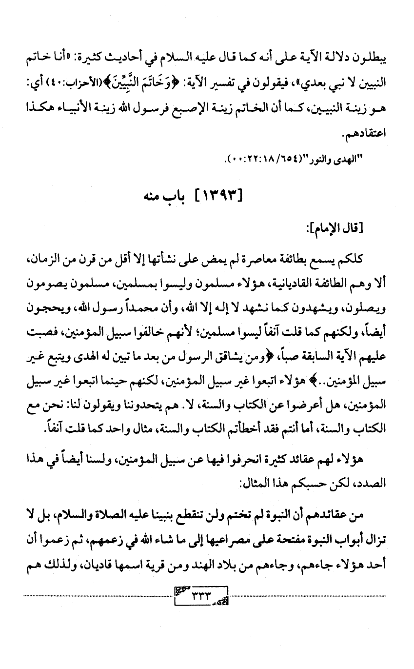 يبطلون دلالة الآية على أنه كما قال عليه السلام في أحاديث كثيرة: «أنا خاتم النبيين لا نبي بعدي»، فيقولون في تفسير الآية: {وَخَاتَمَ النَّبِيِّينَ} (الأحزاب:40) أي: هو زينة النبيين، كما أن الخاتم زينة الإصبع فرسول الله زينة الأنبياء هكذا اعتقادهم.