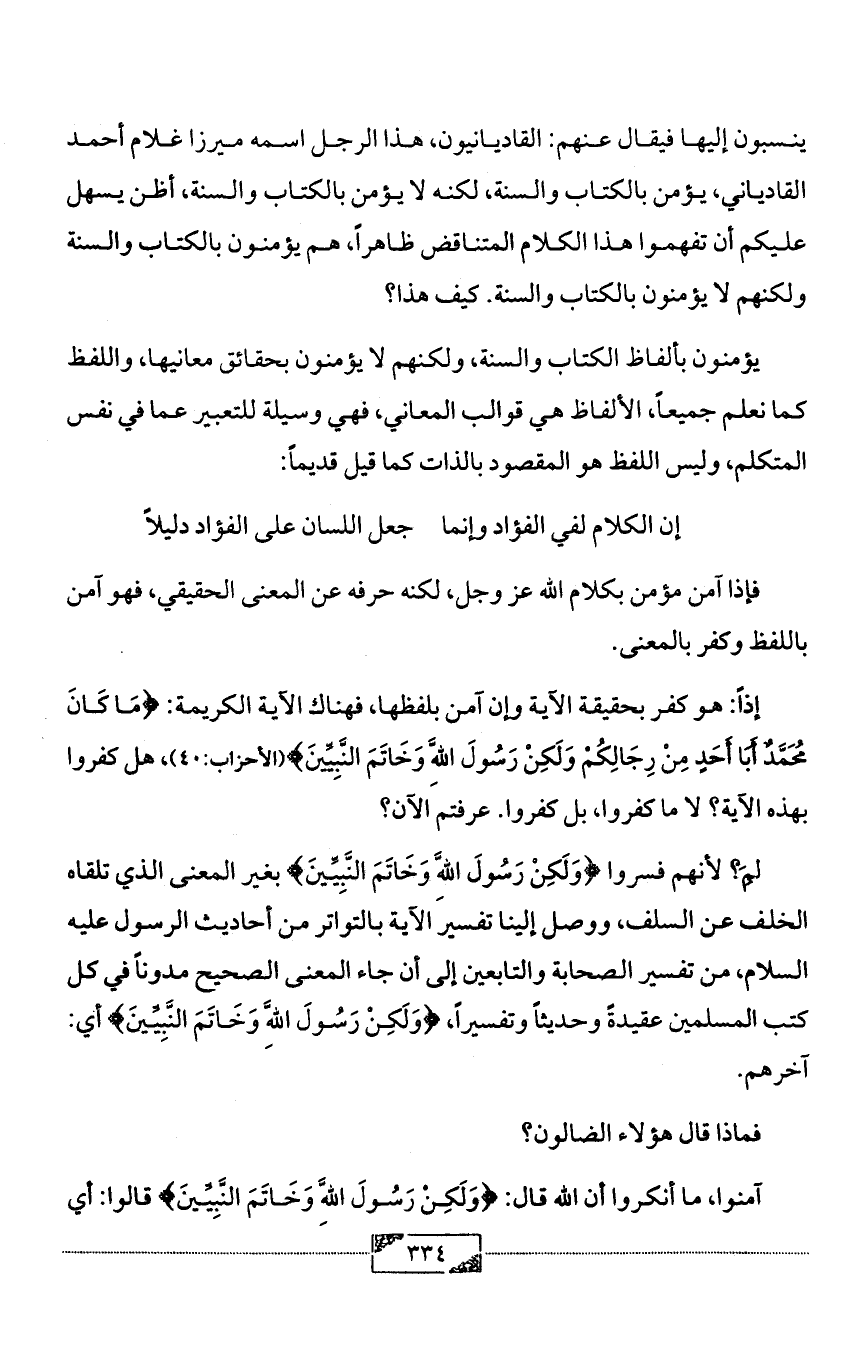 لِمَ؟ لأنهم فسروا {وَلَكِنْ رَسُولَ اللَّهِ وَخَاتَمَ النَّبِيِّينَ} بغير المعنى الذي تلقاه الخلف عن السلف، ووصل إلينا تفسير الآية بالتواتر من أحاديث الرسول عليه السلام، من تفسير الصحابة والتابعين إلى أن جاء المعنى الصحيح مدوناً في كل كتب المسلمين عقيدةً وحديثاً وتفسيراً، {وَلَكِنْ رَسُولَ اللَّهِ وَخَاتَمَ النَّبِيِّينَ} أي: آخرهم.