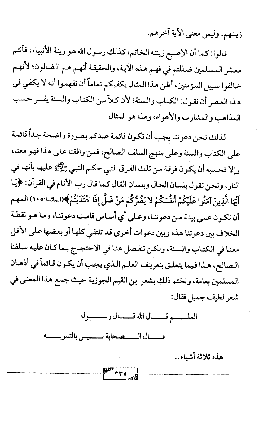 لذلك نحن دعوتنا يجب أن تكون قائمة عندكم بصورة واضحة جداً قائمة على الكتاب والسنة وعلى منهج السلف الصالح، فمن وافقنا على هذا فهو معنا، وإلا فحسبه أن يكون فرقة من تلك الفرق التي حكم النبي - صلى الله عليه وآله وسلم - عليها بأنها في النار، ونحن نقول بلسان الحال وبلسان القال كما قال رب الأنام في القرآن: {يَا أَيُّهَا الَّذِينَ آمَنُوا عَلَيْكُمْ أَنفُسَكُمْ لا يَضُرُّكُمْ مَنْ ضَلَّ إِذَا اهْتَدَيْتُمْ} (المائدة:105) المهم أن نكون على بينة من دعوتنا، وعلى أي أساس قامت دعوتنا، وما هو نقطة الخلاف بين دعوتنا هذه وبين دعوات أخرى قد تلتقي كلها أو بعضها على الأقل معنا في الكتاب والسنة، ولكن تنفصل عنا في الاحتجاج بما كان عليه سلفنا الصالح، هذا فيما يتعلق بتعريف العلم الذي يجب أن يكون قائماً في أذهان المسلمين بعامة، ونختم ذلك بشعر ابن القيم الجوزية حيث جمع هذا المعنى في شعر لطيف جميل فقال: