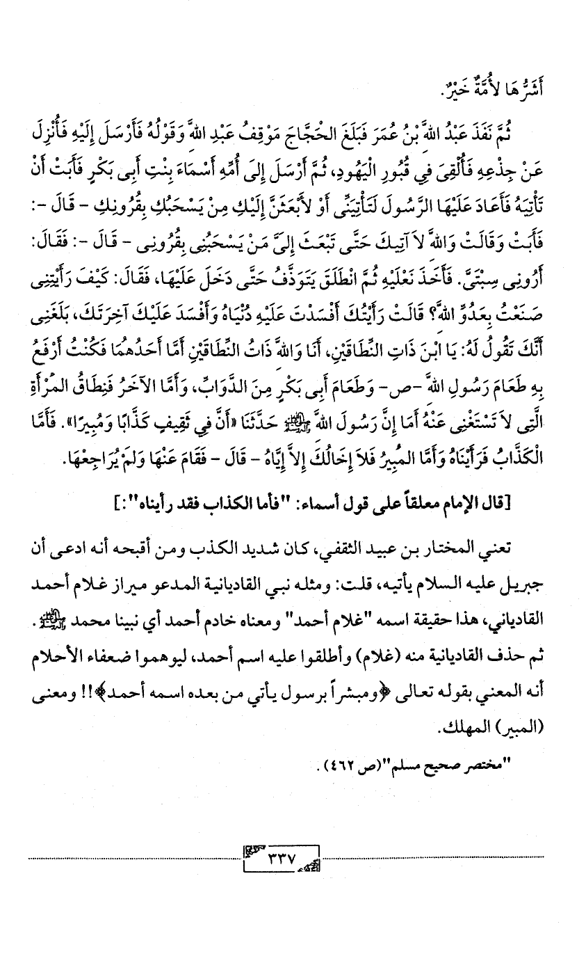 ثُمَّ نَفَذَ عَبْدُ اللَّهِ بْنُ عُمَرَ فَبَلَغَ الْحَجَّاجَ مَوْقِفُ عَبْدِ اللَّهِ وَقَوْلُهُ فَأَرْسَلَ إِلَيْهِ فَأُنْزِلَ عَنْ جِذْعِهِ فَأُلْقِىَ فِي قُبُورِ الْيَهُودِ، ثُمَّ أَرْسَلَ إِلَى أُمِّهِ أَسْمَاءَ بِنْتِ أَبِى بَكْرٍ فَأَبَتْ أَنْ تَأْتِيَهُ فَأَعَادَ عَلَيْهَا الرَّسُولَ لَتَأْتِيَنِّى أَوْ لأَبْعَثَنَّ إِلَيْكِ مِنْ يَسْحَبُكِ بِقُرُونِكِ - قَالَ -: فَأَبَتْ وَقَالَتْ وَاللَّهِ لاَ آتِيكَ حَتَّى تَبْعَثَ إِلَىَّ مَنْ يَسْحَبُنِى بِقُرُونِى - قَالَ -: فَقَالَ: أَرُونِى سِبْتَىَّ. فَأَخَذَ نَعْلَيْهِ ثُمَّ انْطَلَقَ يَتَوَذَّفُ حَتَّى دَخَلَ عَلَيْهَا، فَقَالَ: كَيْفَ رَأَيْتِنِى صَنَعْتُ بِعَدُوِّ اللَّهِ؟ قَالَتْ رَأَيْتُكَ أَفْسَدْتَ عَلَيْهِ دُنْيَاهُ وَأَفْسَدَ عَلَيْكَ آخِرَتَكَ، بَلَغَنِى أَنَّكَ تَقُولُ لَهُ: يَا ابْنَ ذَاتِ النِّطَاقَيْنِ، أَنَا وَاللَّهِ ذَاتُ النِّطَاقَيْنِ أَمَّا أَحَدُهُمَا فَكُنْتُ أَرْفَعُ بِهِ طَعَامَ رَسُولِ اللَّهِ - صلى الله عليه وسلم - وَطَعَامَ أَبِى بَكْرٍ مِنَ الدَّوَابِّ، وَأَمَّا الآخَرُ فَنِطَاقُ الْمَرْأَةِ الَّتِى لاَ تَسْتَغْنِى عَنْهُ أَمَا إِنَّ رَسُولَ اللَّهِ - صلى الله عليه وآله وسلم - حَدَّثَنَا «أَنَّ فِي ثَقِيفٍ كَذَّابًا وَمُبِيرًا». فَأَمَّا الْكَذَّابُ فَرَأَيْنَاهُ وَأَمَّا الْمُبِيرُ فَلاَ إِخَالُكَ إِلاَّ إِيَّاهُ - قَالَ - فَقَامَ عَنْهَا وَلَمْ يُرَاجِعْهَا.
