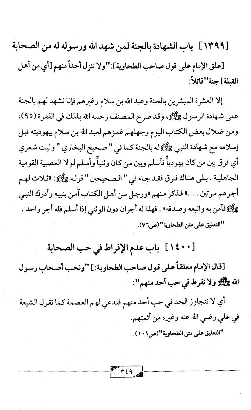 إلا العشرة المبشرين بالجنة وعبد الله بن سلام وغيرهم فإنا نشهد لهم بالجنة على شهادة الرسول - صلى الله عليه وآله وسلم - , وقد صرح المصنف رحمه الله بذلك في الفقرة (95)، ومن ضلال بعض الكتاب اليوم وجهلهم غمزهم لعبد الله بن سلام بيهوديته قبل إسلامه مع شهادة النبي - صلى الله عليه وآله وسلم - له بالجنة كما في " صحيح البخاري " وليت شعري أي فرق بين من كان يهودياًّ فأسلم وبين من كان وثنياًّ وأسلم لولا العصبية القومية الجاهلية. بلى هناك فرق فقد جاء في " الصحيحين " قوله - صلى الله عليه وآله وسلم -: «ثلاث لهم أجرهم مرتين. . .» فذكر منهم «ورجل من أهل الكتاب آمن بنبيه وأدرك النبي - صلى الله عليه وآله وسلم - فآمن به واتبعه وصدقه». فهذا له أجران دون الوثني إذا أسلم فله أجر واحد.