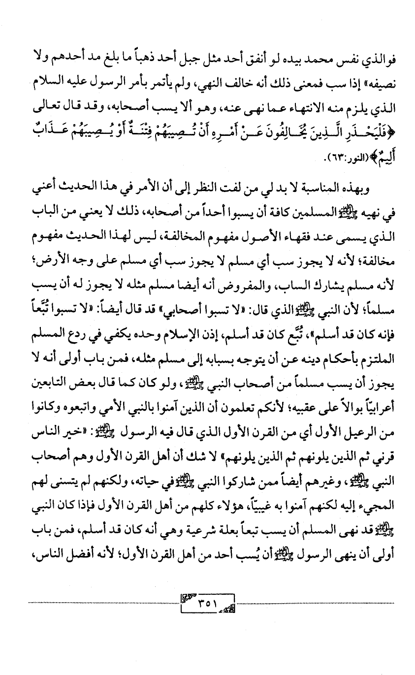 فوالذي نفس محمد بيده لو أنفق أحد مثل جبل أحد ذهباً ما بلغ مد أحدهم ولا نصيفه» إذا سب فمعنى ذلك أنه خالف النهي, ولم يأتمر بأمر الرسول عليه السلام الذي يلزم منه الانتهاء عما نهى عنه, وهو ألا يسب أصحابه, وقد قال تعالى {فَلْيَحْذَرِ الَّذِينَ يُخَالِفُونَ عَنْ أَمْرِهِ أَنْ تُصِيبَهُمْ فِتْنَةٌ أَوْ يُصِيبَهُمْ عَذَابٌ أَلِيمٌ} (النور:63).