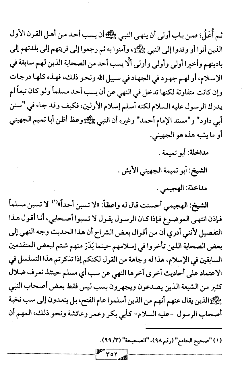 ثم أُعْلُ؛ فمن باب أولى أن ينهى النبي - صلى الله عليه وآله وسلم - أن يسب أحد من أهل القرن الأول الذين أتوا أو وفدوا إلى النبي - صلى الله عليه وآله وسلم - , وآمنوا به ثم رجعوا إلى قريتهم إلى بلدتهم إلى باديتهم وأخيرا أولى وأولى وأولى ألَّا يسب أحد من الصحابة الذين لهم سابقة في الإسلام, أو لهم جهود في الجهاد في سبيل الله ونحو ذلك, فهذه كلها درجات وإن كانت متفاوتة لكنها تدخل في النهي عن أن يسب أحد مسلماً ولو كان تبعاً لم يدرك الرسول عليه السلام لكنه أسلم إسلام الأولين, فكيف وقد جاء في "سنن أبي داود" و"مسند الإمام أحمد" وغيره أن النبي - صلى الله عليه وآله وسلم - وعظ أظن أبا تميم الجهيني أو ما يشبه هذه هو الجهيني.
