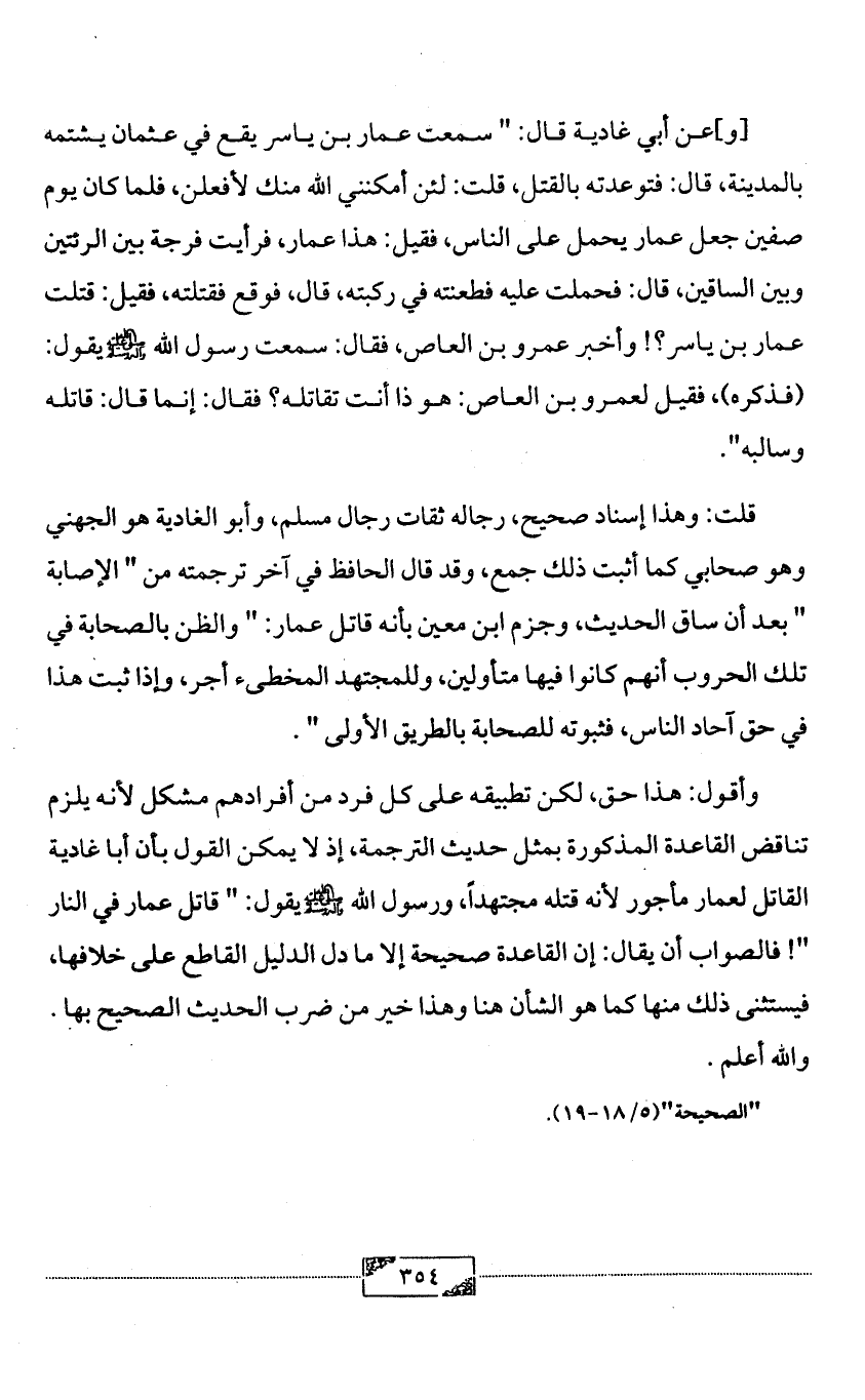 وأقول: هذا حق، لكن تطبيقه على كل فرد من أفرادهم مشكل لأنه يلزم تناقض القاعدة المذكورة بمثل حديث الترجمة، إذ لا يمكن القول بأن أبا غادية القاتل لعمار مأجور لأنه قتله مجتهداً، ورسول الله - صلى الله عليه وآله وسلم - يقول: " قاتل عمار في النار "! فالصواب أن يقال: إن القاعدة صحيحة إلا ما دل الدليل القاطع على خلافها، فيستثنى ذلك منها كما هو الشأن هنا وهذا خير من ضرب الحديث الصحيح بها. والله أعلم.