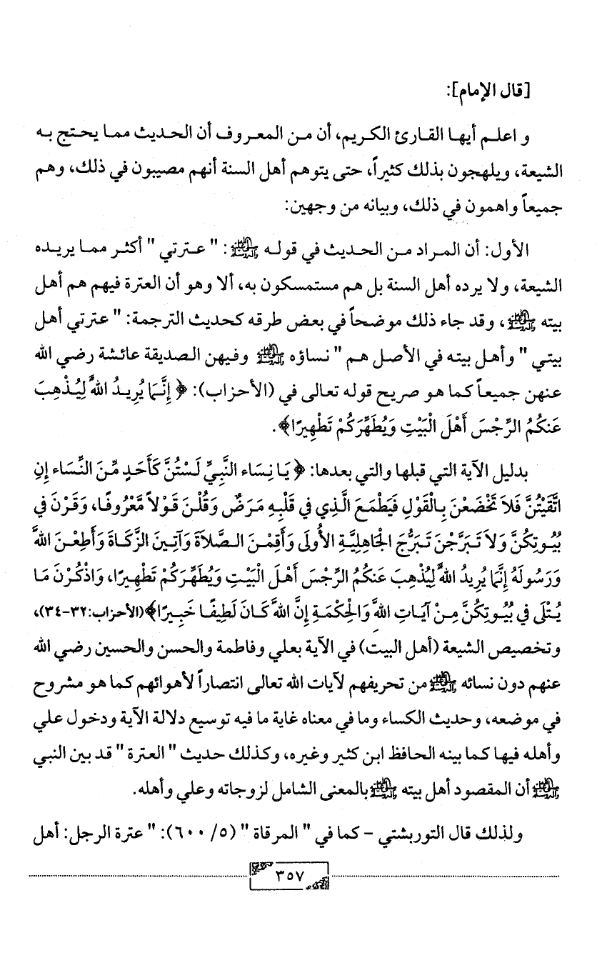 بدليل الآية التي قبلها والتي بعدها: {يَا نِسَاء النَّبِيِّ لَسْتُنَّ كَأَحَدٍ مِّنَ النِّسَاء إِنِ اتَّقَيْتُنَّ فَلاَ تَخْضَعْنَ بِالْقَوْلِ فَيَطْمَعَ الَّذِي في قَلْبِهِ مَرَضٌ وَقُلْنَ قَوْلاً مَّعْرُوفًا، وَقَرْنَ في بُيُوتِكُنَّ وَلاَ تَبَرَّجْنَ تَبَرُّجَ الْجَاهِلِيَّةِ الأُولَى وَأَقِمْنَ الصَّلاَةَ وَآتِينَ الزَّكَاةَ وَأَطِعْنَ اللَّهَ وَرَسُولَهُ إِنَّمَا يُرِيدُ اللَّهُ لِيُذْهِبَ عَنكُمُ الرِّجْسَ أَهْلَ الْبَيْتِ وَيُطَهِّرَكُمْ تَطْهِيرًا، وَاذْكُرْنَ مَا يُتْلَى في بُيُوتِكُنَّ مِنْ آيَاتِ اللَّهِ وَالْحِكْمَةِ إِنَّ اللَّهَ كَانَ لَطِيفًا خَبِيرًا} (الأحزاب:32 - 34)، وتخصيص الشيعة (أهل البيت) في الآية بعلي وفاطمة والحسن والحسين رضي الله عنهم دون نسائه - صلى الله عليه وآله وسلم - من تحريفهم لآيات الله تعالى انتصاراً لأهوائهم كما هو مشروح في موضعه، وحديث الكساء وما في معناه غاية ما فيه توسيع دلالة الآية ودخول علي وأهله فيها كما بينه الحافظ ابن كثير وغيره، وكذلك حديث " العترة " قد بين النبي - صلى الله عليه وآله وسلم - أن المقصود أهل بيته - صلى الله عليه وآله وسلم - بالمعنى الشامل لزوجاته وعلي وأهله.